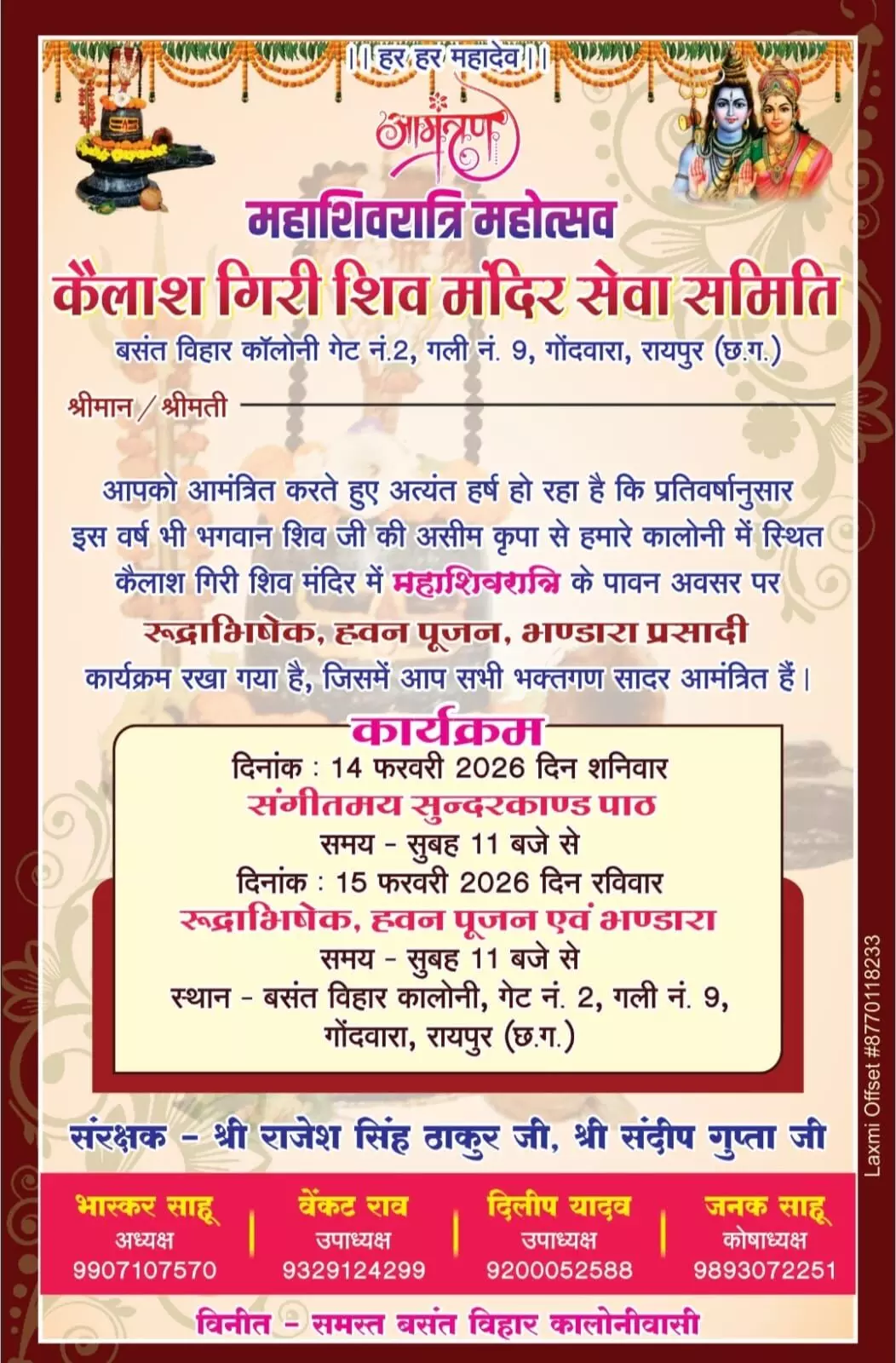आयोजन समिति द्वारा अधिक से अधिक श्रद्धालुओं की सहभागिता सुनिश्चित करने के उद्देश्य से कॉलोनीवासियों को घर-घर जाकर आमंत्रण पत्र वितरित किए जा रहे हैं। साथ ही श्रद्धालुओं की सुविधा, सुरक्षा और व्यवस्थाओं को लेकर भी आवश्यक प्रबंध किए जा रहे हैं। मंदिर समिति ने क्षेत्र के समस्त श्रद्धालुओं से अपील की है कि, वे बड़ी संख्या में उपस्थित होकर सुंदरकांड पाठ एवं महाशिवरात्रि महोत्सव में सहभागिता करें और पुण्य लाभ अर्जित करें।