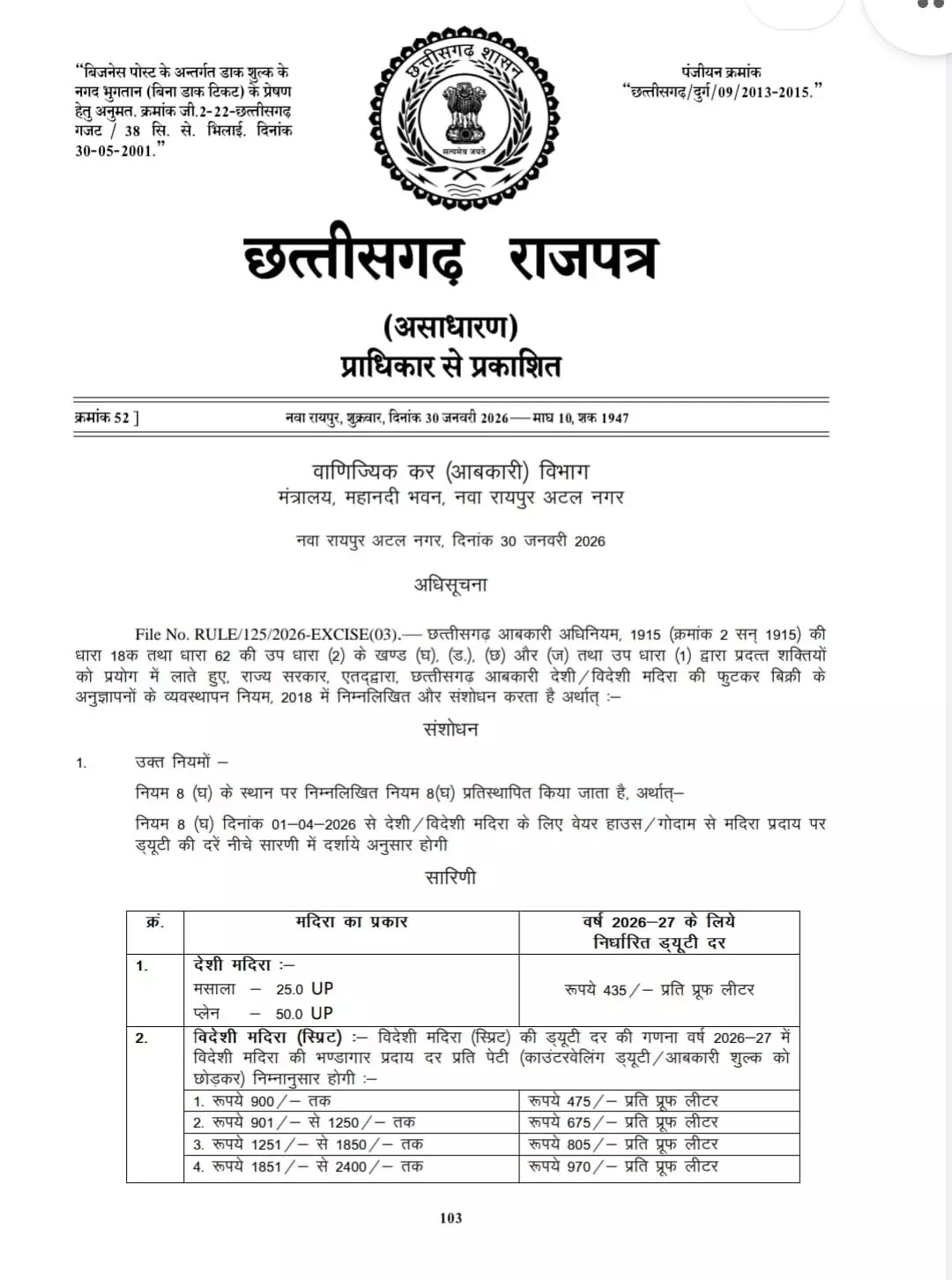 छत्तीसगढ़ सरकार ने आबकारी नियमों में बड़ा बदलाव करते हुए देशी और विदेशी दोनों शराब पर ड्यूटी टैक्स बढ़ा दिया है। नए ड्यूटी दर छत्तीसगढ़ के राजपत्र पर प्रकाशित कर दिया गया है।