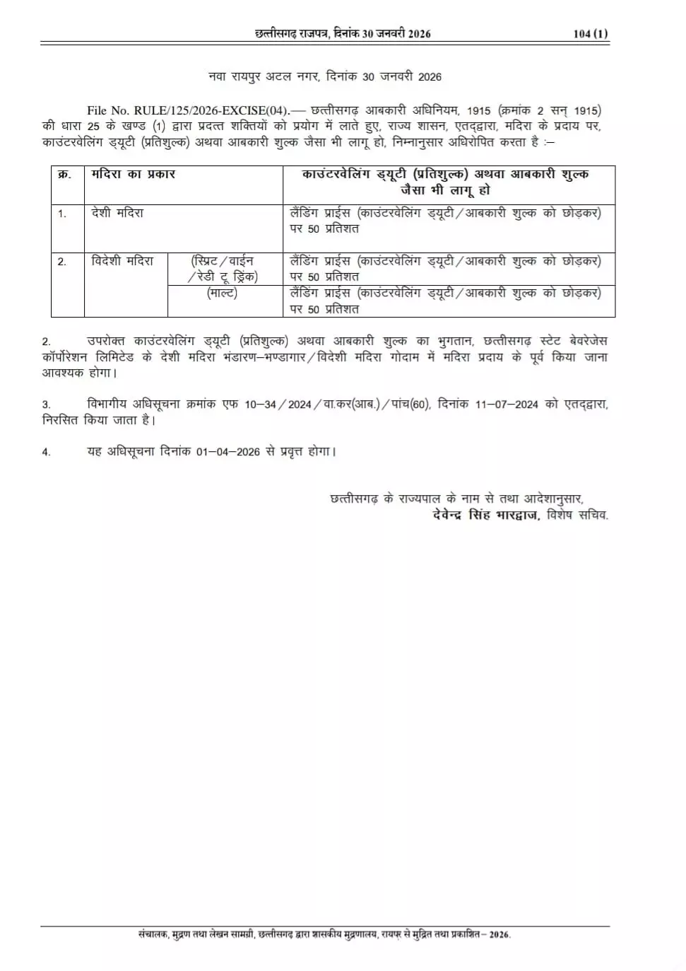 रायपुर। छत्तीसगढ़ के शराब प्रेमियों से जुड़ी बड़ी खबर सामने आई है। सरकार ने आबकारी नियमों में बड़ा बदलाव किया है। 1 अप्रैल 2026 से शराब पर नई ड्यूटी दरें लागू होंगी। देशी और विदेशी दोनों शराब पर ड्यूटी टैक्स बढ़ाया गया है। विदेशी शराब की कीमत के हिसाब से अलग-अलग ड्यूटी तय की गई है।