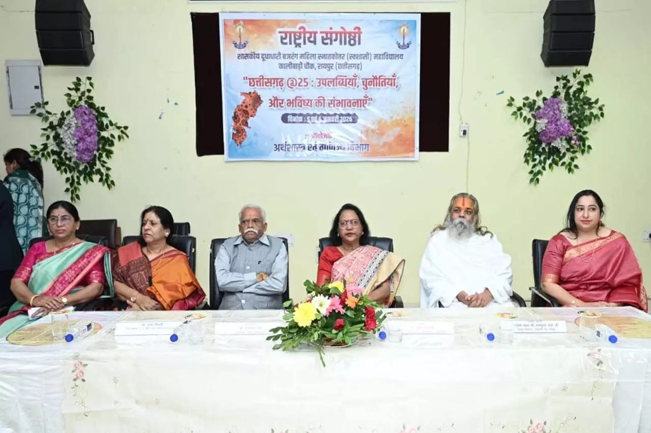 रायपुर। शासकीय दूधाधारी बजरंग महिला स्नातकोत्तर (स्वशासी) महाविद्यालय, रायपुर के अर्थशास्त्र एवं वाणिज्य विभाग द्वारा आयोजित द्वि-दिवसीय राष्ट्रीय संगोष्ठी छत्तीसगढ़ @ 25 : उपलब्धियां, चुनौतियां एवं भावी संभावनाएं का समापन गरिमामय वातावरण में संपन्न हुआ। कार्यक्रम में शिक्षा, अर्थव्यवस्था एवं सामाजिक विकास से जुड़े राष्ट्रीय स्तर के विशेषज्ञों ने राज्य की 25 वर्ष की यात्रा पर विस्तृत चर्चा की।