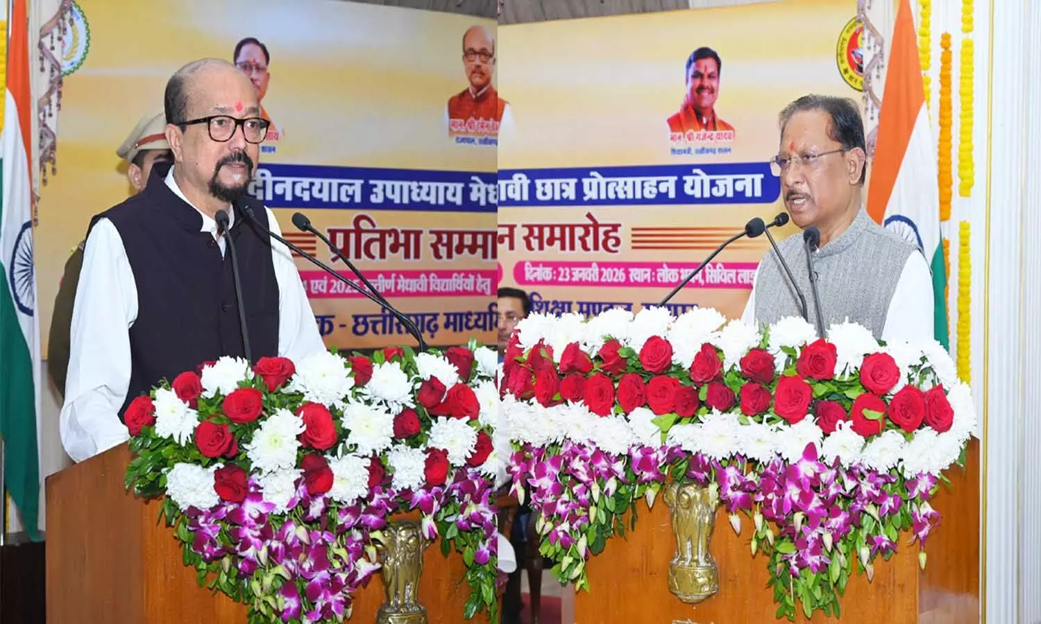 रायपुर। छत्तीसगढ़ की राजधानी रायपुर में राज्यपाल रमेन डेका के मुख्य आतिथ्य और मुख्यमंत्री विष्णुदेव साय की अध्यक्षता में लोक भवन में 10वीं और 12वीं के मेधावी विद्यार्थियों को सम्मानित किया गया। ये 2024 और 2025 के टॉप 10 मेधावी और विशेष पिछडी जनजाति के टॉप 01 विद्यार्थी है। स्कूल शिक्षा मंत्री गजेन्द्र यादव विशेष अतिथि के रूप में उपस्थित थे। लोकभवन के छत्तीसगढ़ मण्डपम् में माध्यमिक शिक्षा मंडल द्वारा आयोजित इस प्रतिभा सम्मान समारोह में पंडित दीनदयाल उपाध्याय मेधावी छात्र प्रोत्साहन योजना के तहत विद्यार्थियों को सम्मानित किया गया।