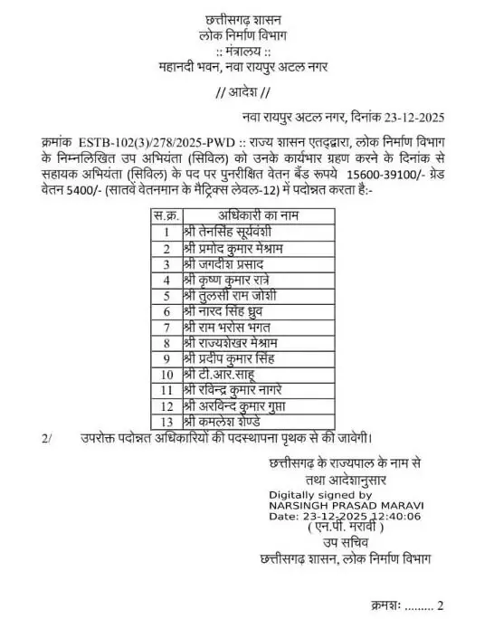 छत्तीसगढ़ सरकार ने PWD के 13 उप अभियंताओं को पदोन्नति देकर उन्हें सहायक अभियंता बनाया है। इसके लिए बाक़ायदा लोक निर्माण विभाग द्वारा आदेश जारी किया गया है।