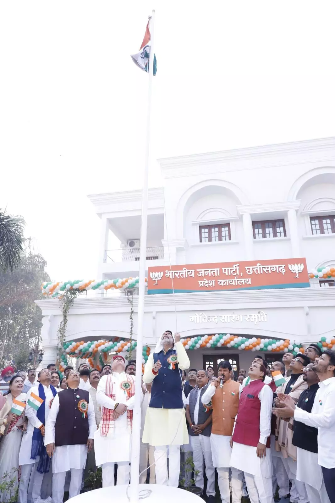 रायपुर। भारतीय गणतंत्र पर्व की 76वीं वर्षगाँठ पर राजधानी के कुशाभाऊ ठाकरे परिसर स्थित बीजेपी के प्रदेश कार्यालय में क्षेत्रीय संगठन महामंत्री अजय जम्वाल और प्रदेश अध्यक्ष किरण देव ने राष्ट्रीय ध्वज तिरंगा फहराया। भाजपा प्रदेश अध्यक्ष श्री देव ने भारत की सांस्कृतिक और सामाजिक विविधता को रेखांकित करते हुए कहा कि हमारा देश 'अनेकता में एकता' का जीवंत उदाहरण है। कश्मीर से कन्याकुमारी और पूर्व से पश्चिम तक, भारत एक अखंड सूत्र में बंधा हुआ है।