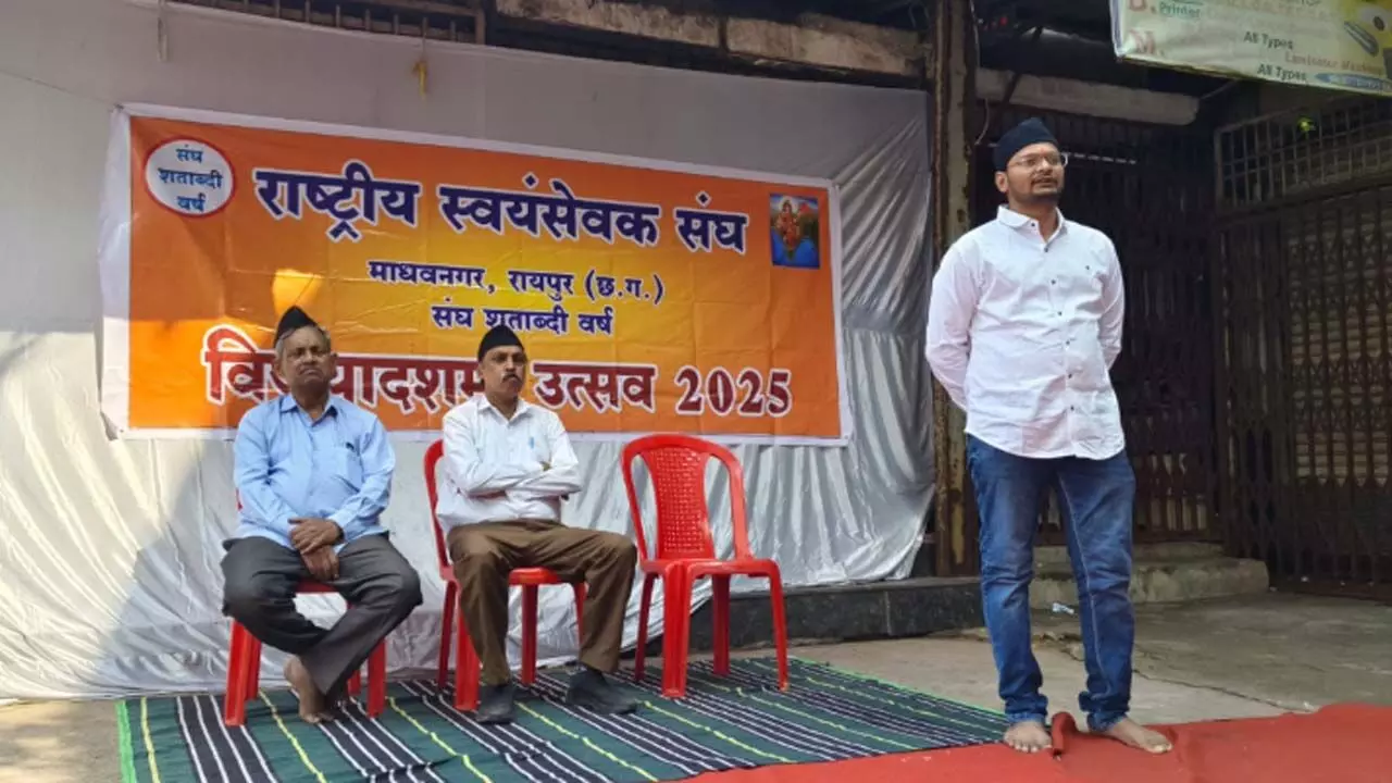 रायपुर। माधव नगर जोरापारा बस्ती में राष्ट्रीय स्वयंसेवक संघ (RSS) ने अपने शताब्दी वर्ष के उपलक्ष्य में विजयदशमी उत्सव का आयोजन किया। कार्यक्रम का आयोजन आर.डी. बिल्डिंग मैदान, शारदा चौक में किया गया, जिसमें बड़ी संख्या में स्वयंसेवक और गणमान्य नागरिक शामिल हुए।