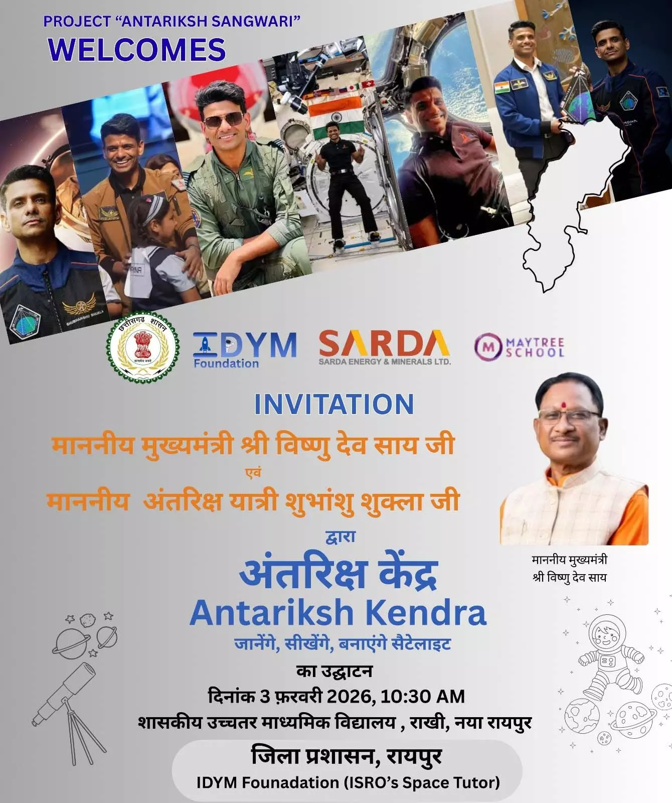 रायपुर। मंगलवार को अंतरिक्ष विज्ञान के एक ऐतिहासिक क्षण का साक्षी बनने जा रहा है रायपुर। नवा रायपुर में प्रदेश का पहला अत्याधुनिक अंतरिक्ष केंद्र लोकार्पित किया जाएगा। इस अवसर पर भारत के गगनयान मिशन से जुड़े अंतरिक्ष यात्री ग्रुप कैप्टन शुभांशु शुक्ला विशेष रूप से छत्तीसगढ़ पहुंच रहे हैं। जिला प्रशासन रायपुर, IDYM फाउंडेशन और सारडा एनर्जी के संयुक्त प्रयास से विकसित यह केंद्र छात्रों को अंतरिक्ष विज्ञान की वास्तविक और प्रायोगिक दुनिया से जोड़ने की दिशा में बड़ा कदम माना जा रहा है।