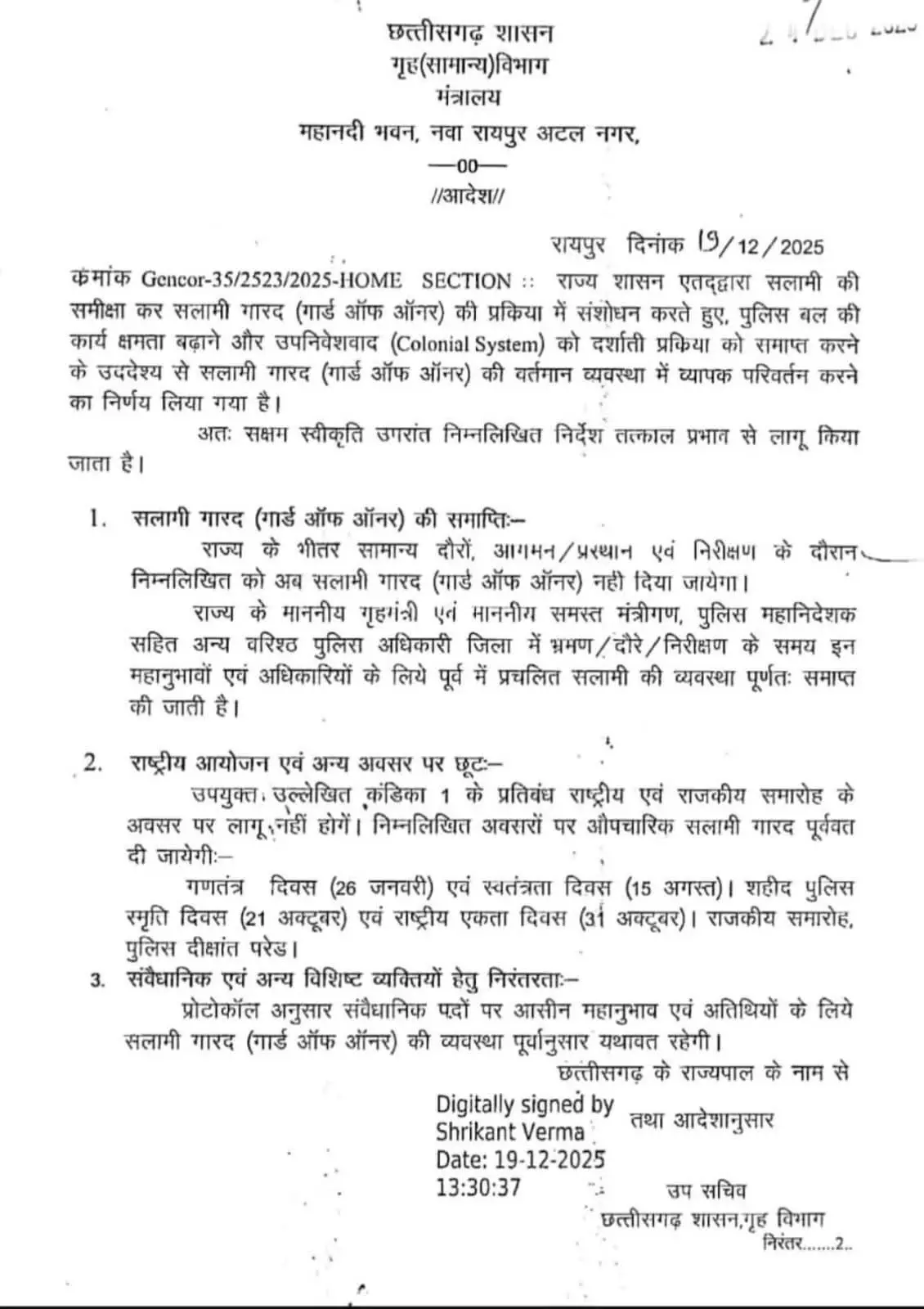 जारी आदेश के तहत राज्य के भीतर सामान्य दौरों, आगमन-प्रस्थान एवं निरीक्षण के दौरान अब गृहमंत्री, समस्त मंत्रीगण, पुलिस महानिदेशक सहित अन्य वरिष्ठ पुलिस अधिकारियों को सलामी गारद (गार्ड ऑफ ऑनर) नहीं दिया जाएगा। जिला भ्रमण, दौरे या निरीक्षण के समय पूर्व में प्रचलित सलामी व्यवस्था को पूर्णतः समाप्त कर दिया गया है। इससे पुलिस बल का समय और ऊर्जा का प्रभावी उपयोग सुरक्षा, कानून-व्यवस्था तथा जनसेवा के कार्यों में हो सकेगा।