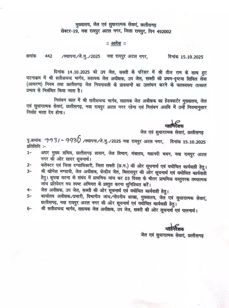 राजीव लोचन साहू- सक्ती। छत्तीसगढ़ के सक्ती जिले से एक हैरान कर देने वाला मामला सामने आया था। जहां उप जेल बाहर जेलर का कैदी से मारपीट का वीडियो वायरल हो रहा है। इस मामले को गंभीरता से लेते हुए उप जेल के जेलर को जेल एवं सुधारात्मक सेवाएं, महानिर्देशक ने निलंबित कर दिया है।