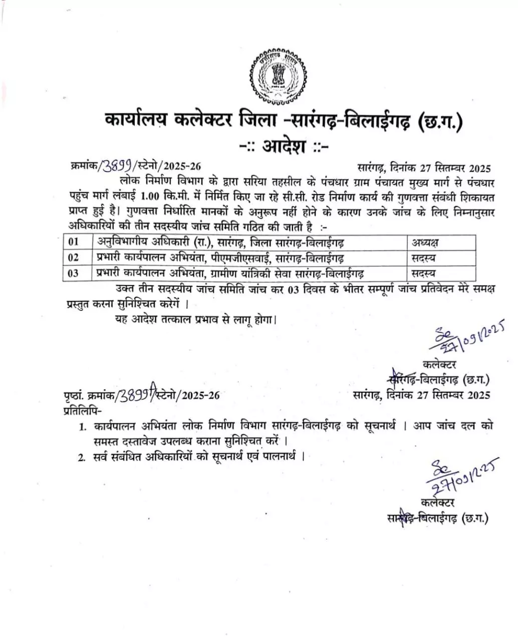 ग्रामीणों की गूंज सुनकर कलेक्टर डॉ. संजय कन्नौजे ने सख्त रुख अपनाते हुए तुरंत तीन सदस्यीय जांच टीम बना दी है। टीम की कमान एसडीएम वर्षा बंसल को दी गई है। उनके साथ निर्माण एजेंसी के अधिकारी और तकनीकी अमला शामिल रहेंगे। कलेक्टर ने दो टूक कह दिया है कि, गुणवत्ता से समझौता किसी भी कीमत पर बर्दाश्त नहीं होगा। दोषियों को बख्शा नहीं जाएगा।