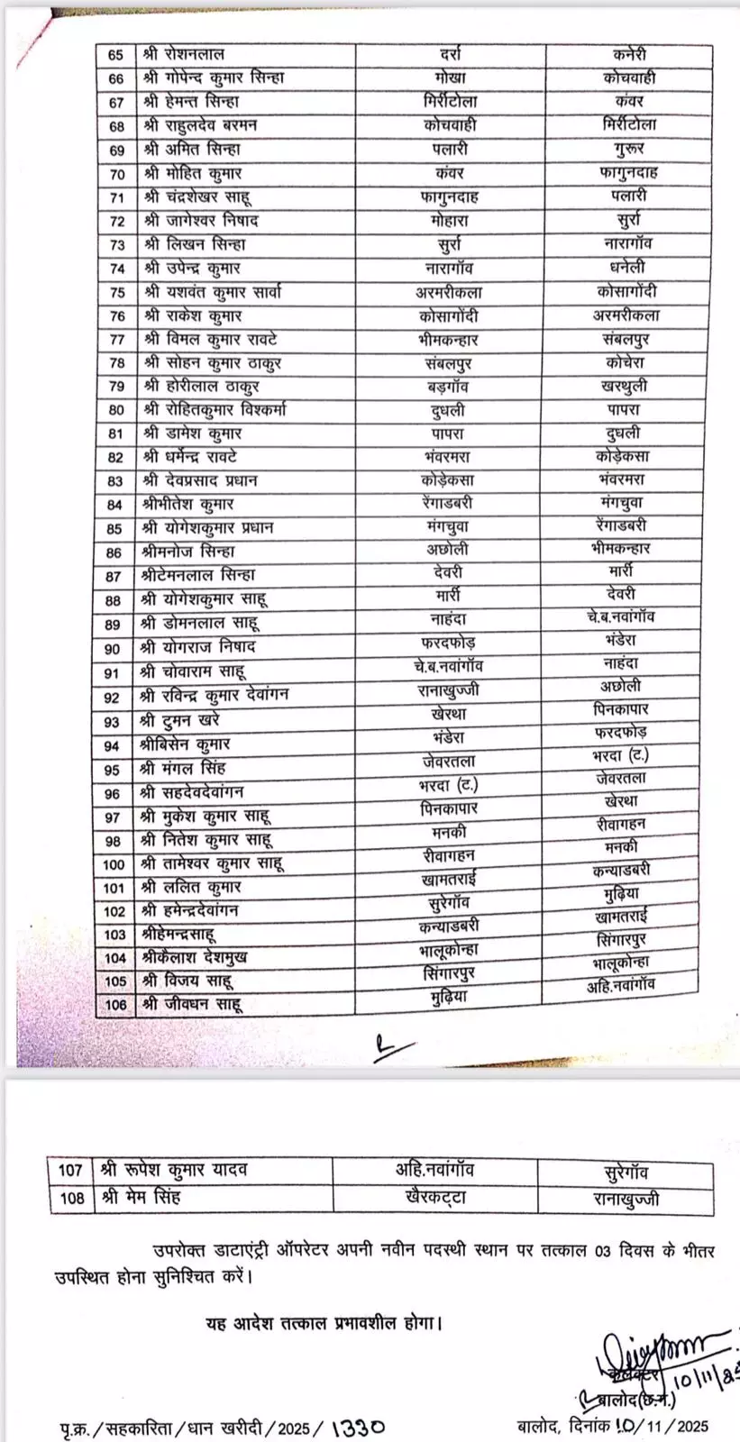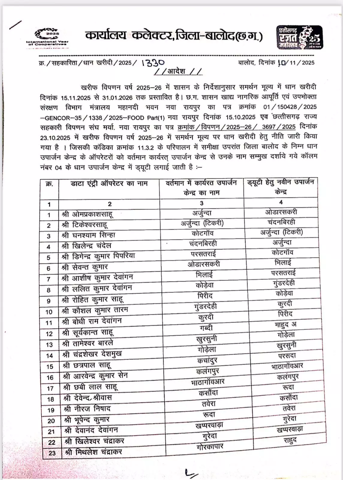 राहुल भूतड़ा- बालोद। छत्तीसगढ़ के बालोद जिले के सहकारी समिति के प्रबंधक और डाटा एंट्री ऑपरेटर हड़ताल पर है। इसी बीच जिले के 108 डाटा एंट्री ऑपरेटरों को इधर से उधर कर दिया गया है। सभी की नए खरीदी केंद्रों में ड्यूटी लगाई गई है। इस संबंध में कलेक्टर ने आदेश जारी किया है। सभी को 3 दिन के भीतर नए केंद्र में उपस्थित होने के निर्देश दिए हैं।