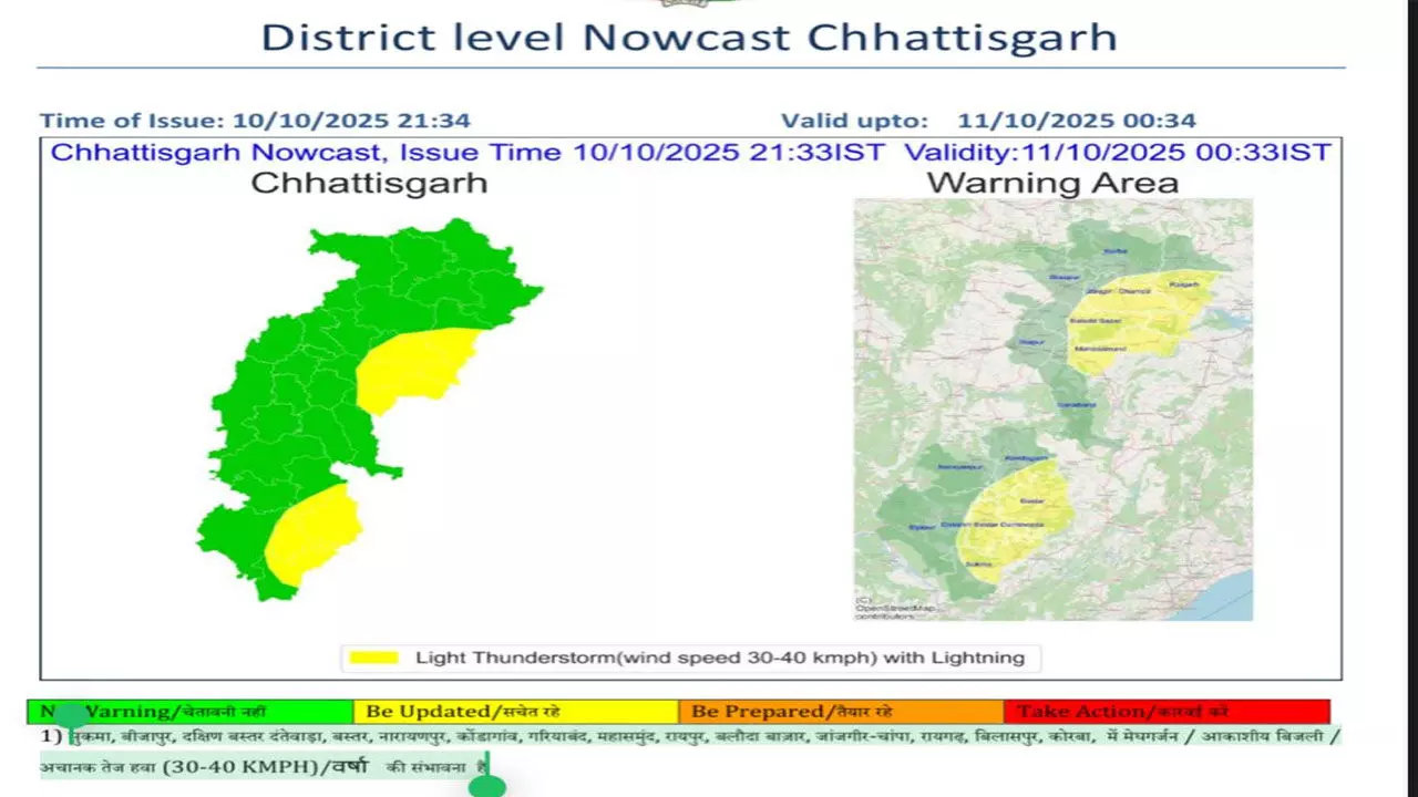 मौसम विभाग ने सुकमा, बीजापुर, दक्षिण बस्तर दंतेवाडा, बस्तर, नारायणपुर, कोंडागांव, गरियाबंद , महासमुंद, रायपुर, बलौदा बाजार, जांजगीर-चांपा, रायगढ़, बिलासपुर, कोरबा, में येलो अलर्ट जारी किया है।