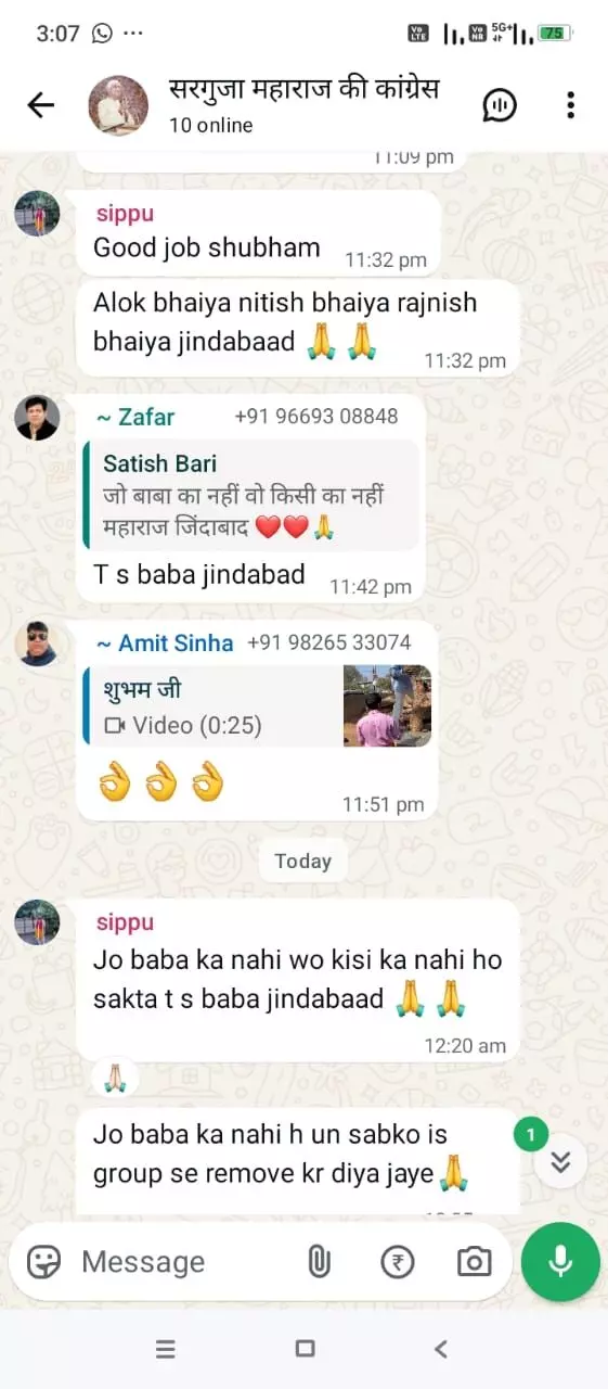संतोष कश्यप- अंबिकापुर। छत्तीसगढ़ के अंबिकापुर में एक बार फिर कांग्रेस में गुटबाजी देखने को मिली है। जहां सरगुजा महाराज की कांग्रेस व्हाट्सएप ग्रुप में हुई चर्चाओं की बात वायरल हो रही है। इस ग्रुप के चैट्स में कहा जा रहा है कि, सरगुजा महराज टी एस बाबा का ग्रुप है ये बघेल का नहीं। बघेल विचारधारा वाले सम्मानित सदस्यों से निवेदन है स्वतः ग्रुप छोड़ दें, नहीं तो बहुत खराब लगेगा कोई निकलेगा तो!