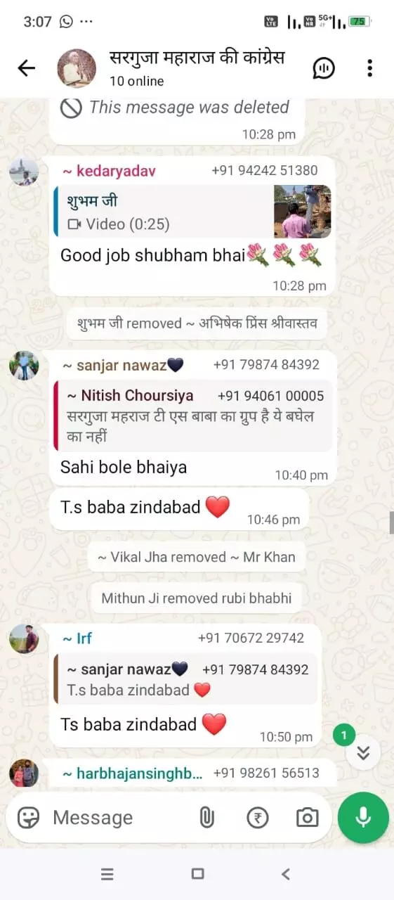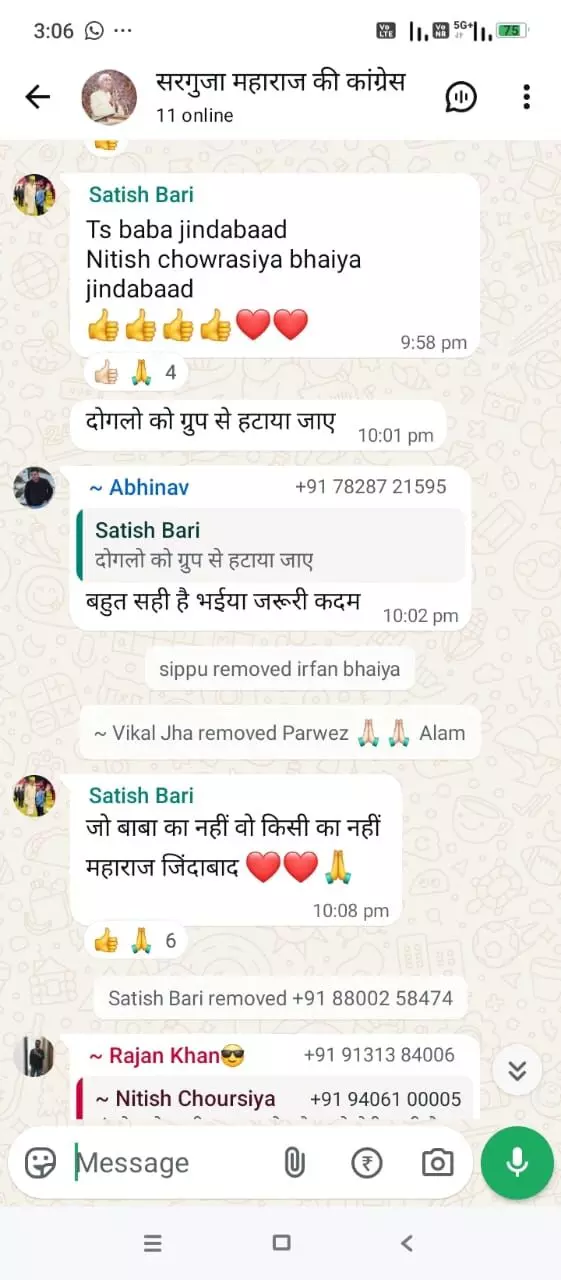 हाल ही में पूर्व मुख्यमंत्री भूपेश बघेल के अंबिकापुर दौरे में टी एस सिंह देव के समर्थन में शामिल नहीं हुए थे। ग्रुप में जुड़े कांग्रेस कार्यकर्ता जो भूपेश बघेल के स्वागत में शामिल हुए उन्हें ग्रुप से किया रिमूव जा रहा। करीब एक दर्जन कांग्रेसी कार्यकर्ताओं को सरगुजा महाराज की कांग्रेस ग्रुप से रिमूव किया गया। ग्रुप में कहां जा रहा है जो बाबा का नहीं वह किसी का नहीं।