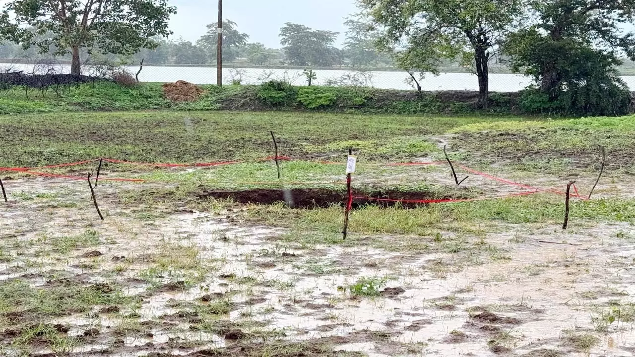 बालोद जिले में बस्ती और तालाब के बीच एक खेत में अचानक खेत में जमीन धंसी दिखी। गड्ढा लगभग 15 फीट लंबा व 15 फीट चौड़ा है। दूर से देखने पर अंदर पानी उबाल मार रहा...@BalodDistrict #Chhattisgarh pic.twitter.com/JvEpk56rh2