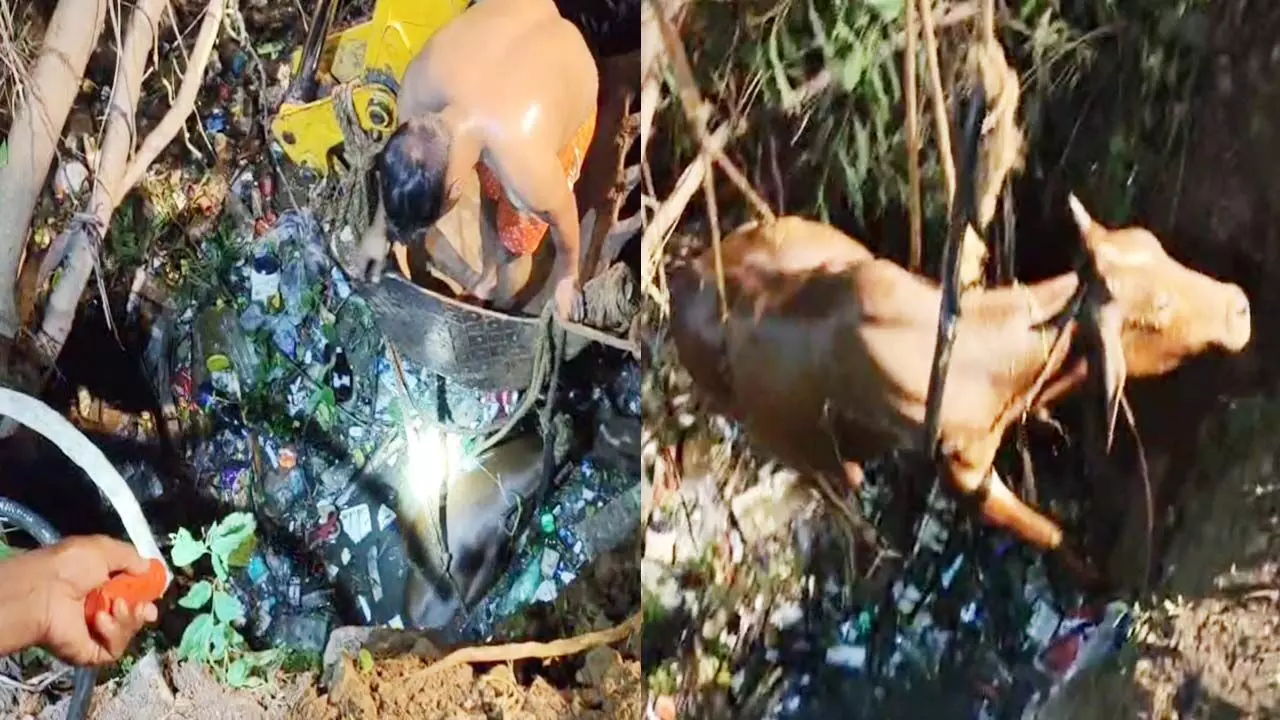 कुएं में गिरी गाय: ग्रामीणों ने 3 घंटे की कड़ी मशक्कत के बाद बाहर निकाला