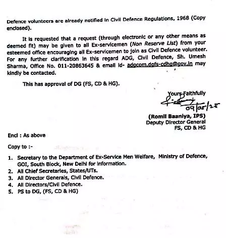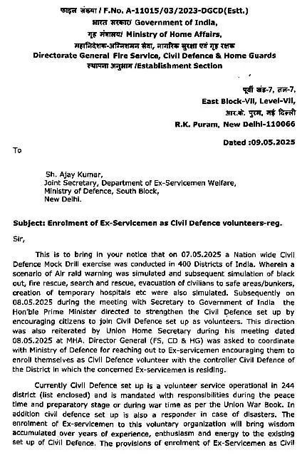दरअसल, 9 मई को गृह मंत्रालय की ओर से एक अहम पत्र जारी हुआ है, जिसमें पूर्व सैनिकों को देशभर के 400 से अधिक जिलों में सिविल डिफेंस के तहत वॉलिंटियर के रूप में सेवा देने का आह्वान किया गया है। इस आदेश के बाद पूर्व सैनिकों ने एक बार फिर राष्ट्र सेवा का दायित्व अपने कंधों पर ले लिया है।
