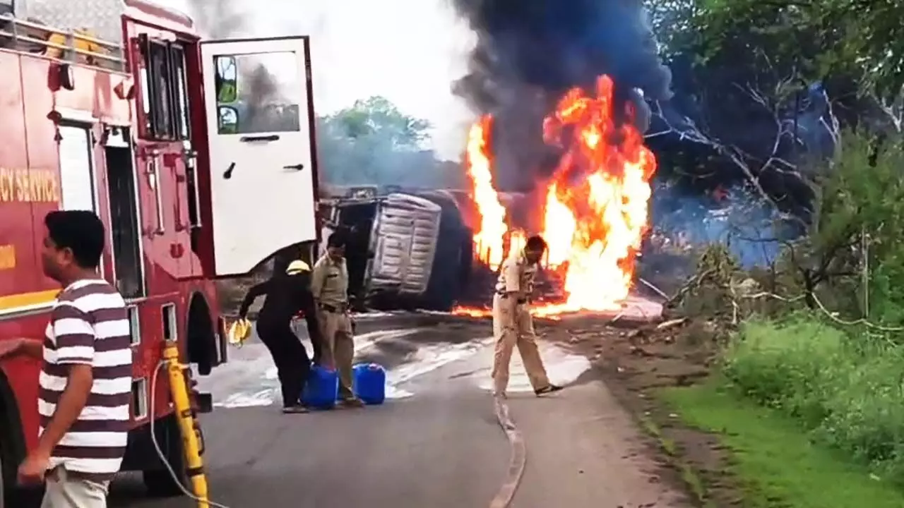 बताया जा रहा है कि, अचानक लगी आग को देखकर ड्राइवर ने कूद कर अपनी जान बचाई। टैंकर में ज्वलनशील तरल पदार्थ डीजल या पेट्रोल भरा हुआ था जो सड़क में बह रहा था। घटनास्थल पर फायर ब्रिगेड भी पहुंच गई है। आग बुझाने का प्रयास जारी है। यह घटना शनिवार शाम 5 बजे की है। मार्ग के दोनों और गाड़ियों का लंबा जाम लग गया।