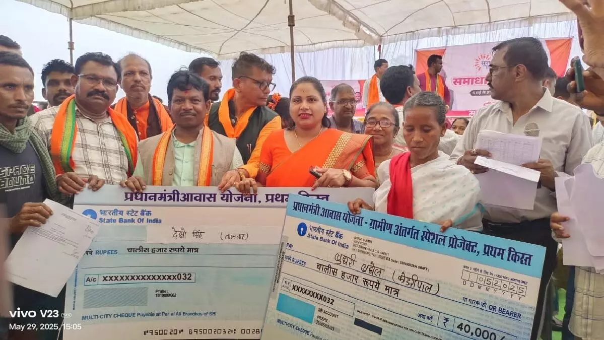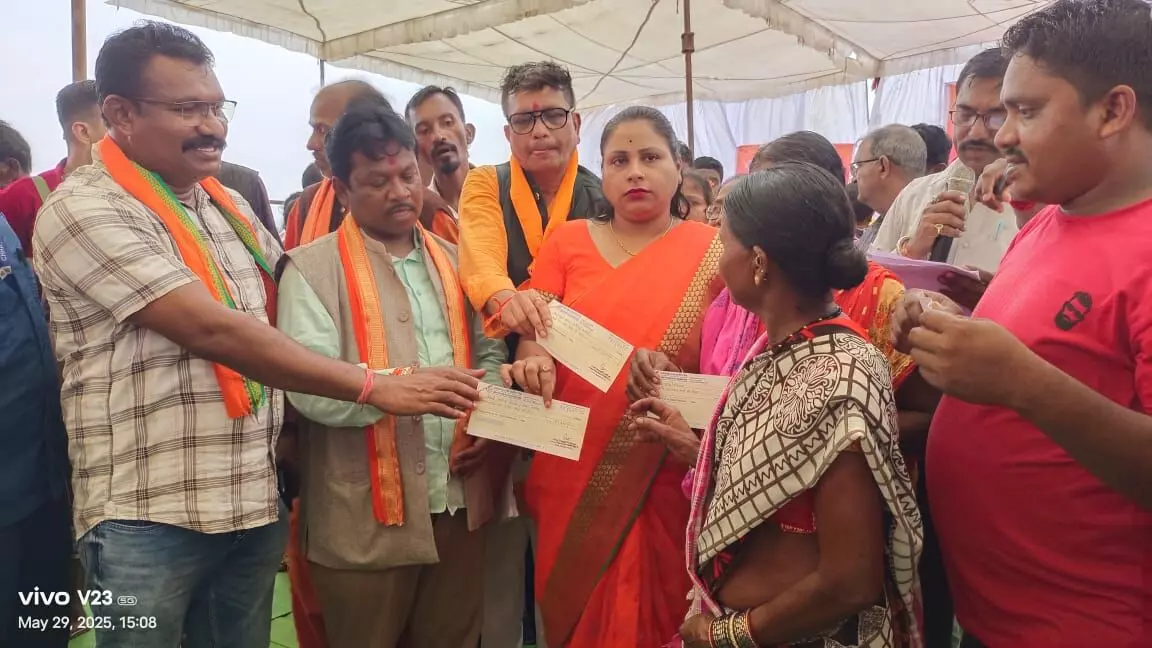 समाधान शिविर में लोगों को चेक वितरित करते सांसद महेश कश्यप