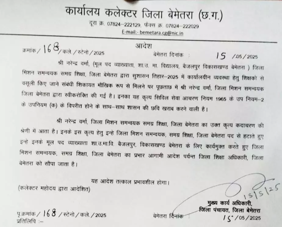 इस अनियमितता को लेकर शिक्षकों ने जिला कलेक्टर रणबीर शर्मा से मौखिक शिकायत की, जिसके बाद प्रशासन तुरंत हरकत में आया। कलेक्टर के स्पष्ट निर्देश के बाद जिला शिक्षा अधिकारी ने कार्रवाई करते हुए मिशन समन्वयक पद पर कार्यरत शिक्षक को पद से हटा दिया। आरोपी शिक्षक नरेंद्र वर्मा को उनके मूल पद शासकीय उच्च माध्यमिक शाला बैजलपुर में पदस्थ कर दिया गया है। यह कार्रवाई जिला प्रशासन की भ्रष्टाचार और अनियमितता के प्रति जीरो टॉलरेंस की नीति को दर्शाती है।