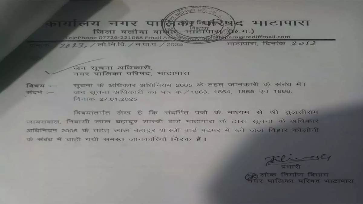 तुलसीराम जायसवाल-भाटापारा। छत्तीसगढ़ में बलौदाबाजार भाटापारा जिले के लाल बहादुर शास्त्री वार्ड (वार्ड क्रमांक 25), पटपर में एक अवैध कॉलोनी का मामला सामने आया है, जो नगर पालिका के आधिकारिक रिकॉर्ड में दर्ज ही नहीं है। सूचना के अधिकार (RTI) के तहत खुलासा हुआ है कि यहां लगभग 40 परिवार निवासरत हैं, पर कॉलोनी से संबंधित कोई भी दस्तावेज नगर पालिका के पास उपलब्ध नहीं हैं।