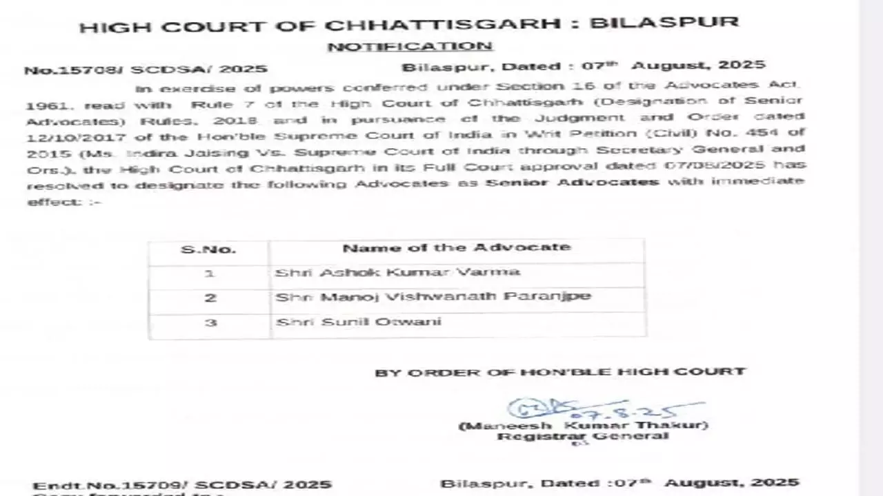 यह निर्णय 7 अगस्त 2025 को फुल कोर्ट की बैठक में लिया गया। यह छत्तीसगढ़ हाई कोर्ट सीनियर एडवोकेट डेजिगनेशन रूल्स, 2018 के नियम 7 और सुप्रीम कोर्ट के इंदिरा जयसिंह के मामले में दिए गए आदेश के अनुपालन में किया गया है।