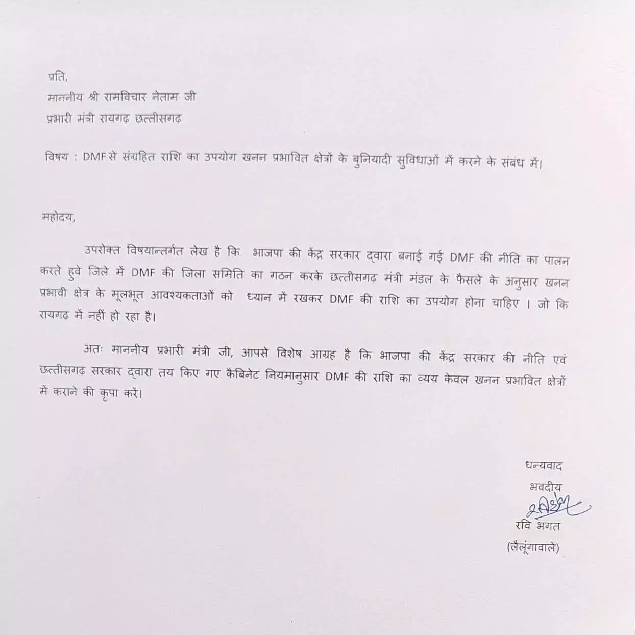 रायपुर। भारतीय जनता युवा मोर्चा (BJYM ) छत्तीसगढ़ के पूर्व अध्यक्ष रवि भगत ने DMF को लेकर प्रभारी मंत्री को पत्र लिखा है। जिसमें उनहोंने प्रभारी मंत्री राम विचार नेताम से DMF राशि का खनन प्रभावित क्षेत्रों में उपयोग करने की मांग उठाई है। रवि भगत ने DMF फंड का उपयोग नहीं होने की भी बात कही है। वहीं इसके पूर्व भी रवि भगत ने सोशल मीडिया में मुद्दा उठाया था। मामले मे बीजेपी ने नोटिस जारी किया था। जवाब मिलने पर पार्टी ने उनके आचरण को पार्टी विरोधी नहीं माना था।