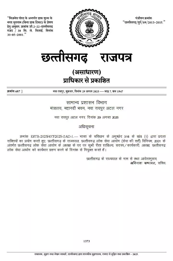 रायपुर। छत्तीसगढ़ लोकसेवा आयोग के अध्यक्ष पद पर रीता शांडिल्य को नियुक्त किया गया है। राज्यपाल के आदेश पर इस संबंध में आदेश ने सचिव सामान्य प्रशासन विभाग अविनाश चम्पावत ने जारी किए हैं। उनकी नियुक्ति कार्यभार ग्रहण करने के दिन से ही प्रभावी मानी जाएगी।