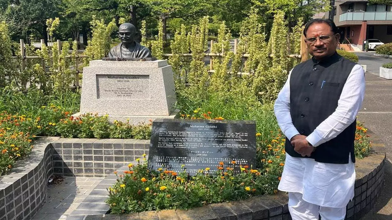 टोक्यो स्थित लिटिल इंडिया में महात्मा गांधी की प्रतिमा के सामने सीएम साय