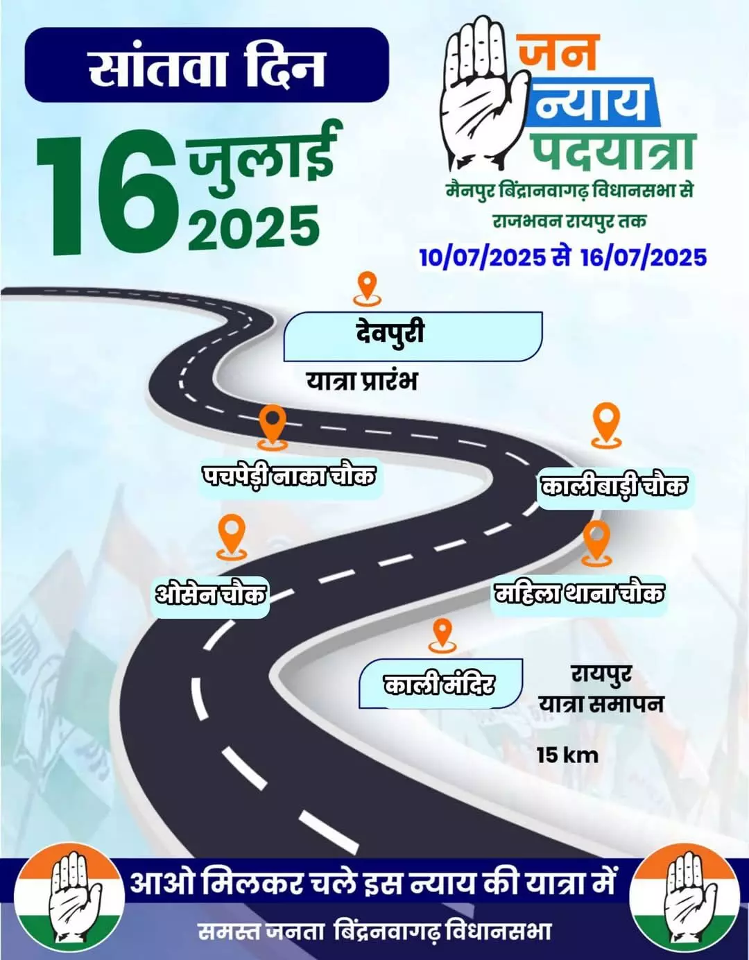 कांग्रेस पार्टी छत्तीसगढ़ के जन न्याय पदयात्रा का आज समापन होगा। अंतिम दिवस में कांग्रेसी राजभवन जाकर राज्यपाल को ज्ञापन सौंपेंगे।