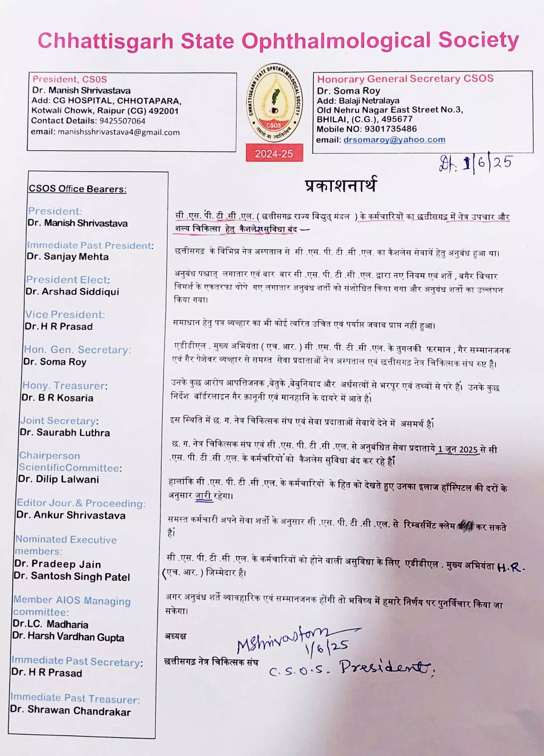 CSPTCL कर्मचारियों के लिए कैशलेस सुविधा बंद: छत्तीसगढ़ नेत्र चिकित्सक संघ ने जारी किया पत्र, मुख्य अभियंता पर लगाये गंभीर आरोप