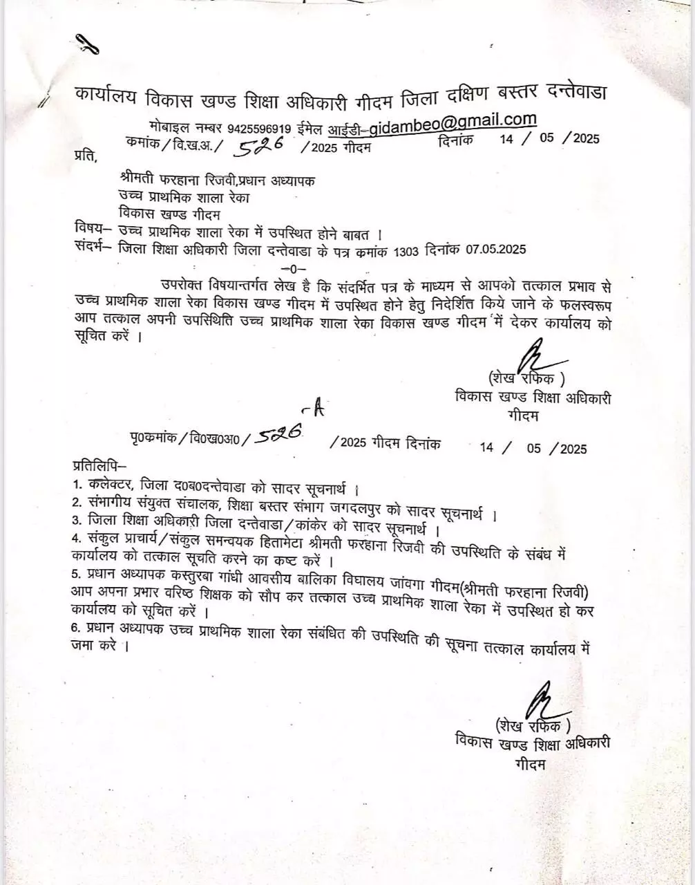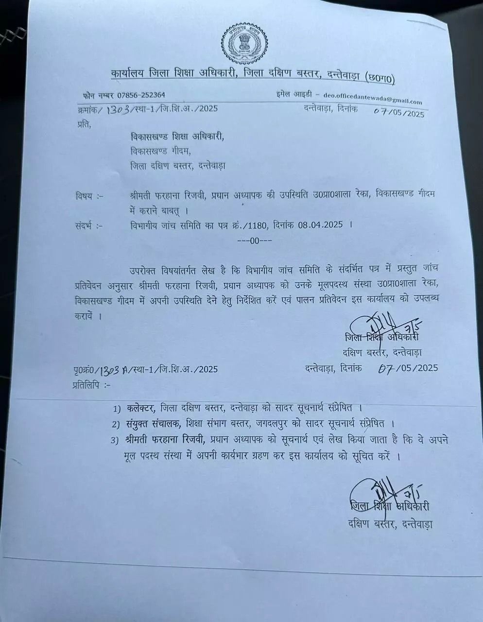 जिला शिक्षा अधिकारी कार्यलय से 7 मई को पत्र जारी हुआ है। विभागीय जांच का हवाला देते हुए प्रधानाध्यापक फरहाना रिजवी को उच्चतर माध्यमिक विद्यालय रेका पदस्थ होने के लिए आदेश जारी हुआ। इस पत्र के बावजूद वे मूल संस्था में नहीं गई। न ही पत्र का कोई जबाब दिया। ठीक इसी तरह विकास खंड शिक्षा अधिकारी कार्यालय से 14 मई को फरहाना रिजवी को नोटिस जारी हुआ। इस नोटिस में लिखा था मूल पदस्थपा पहुंच कर कार्य भार संभालने की बात लिखी गई। डीईओ और बीईओ दोनों कार्यालयों के पत्र की खुली आवेहलना कर रही है।