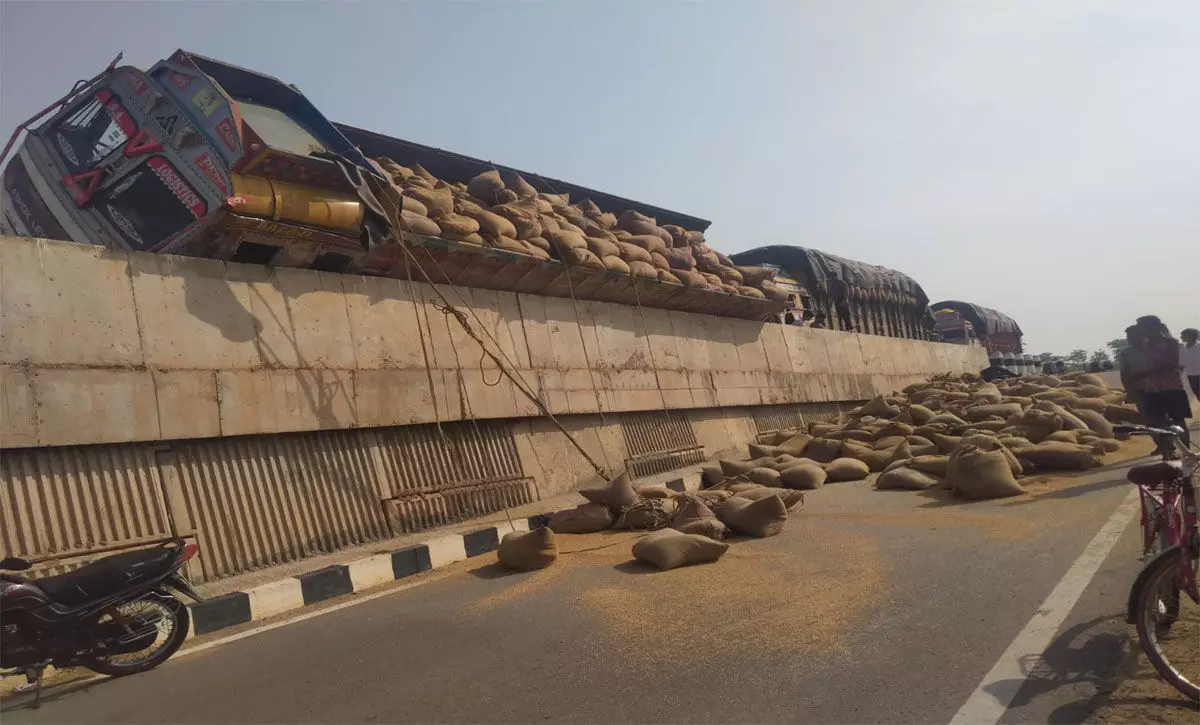 अनियंत्रित होकर पलटा ट्रक: ओवरलोड के कारण हुआ हादसा, सड़क पर बिखरा कई क्विंटल धान