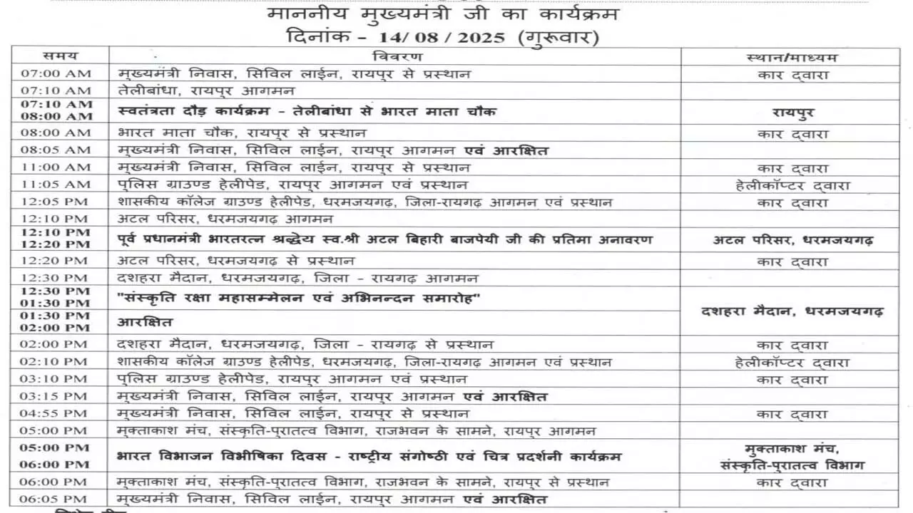 दोपहर 2:10 बजे मुख्यमंत्री साय शासकीय कॉलेज ग्राउंड हेलीपेड, धरमजयगढ़ से रायपुर के लिए प्रस्थान करेंगे। मुख्यमंत्री के के कार्यक्रम से राज्य में सांस्कृतिक, ऐतिहासिक और देशभक्ति से जुड़ी गतिविधियों को बढ़ावा मिलने की उम्मीद है।