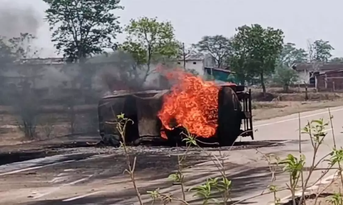 नेशनल हाईवे 30 पर बड़ा हादसा: डीजल टैंकर पलटने से लगी आग, ड्राइवर-क्लीनर गंभीर रूप से झुलसे