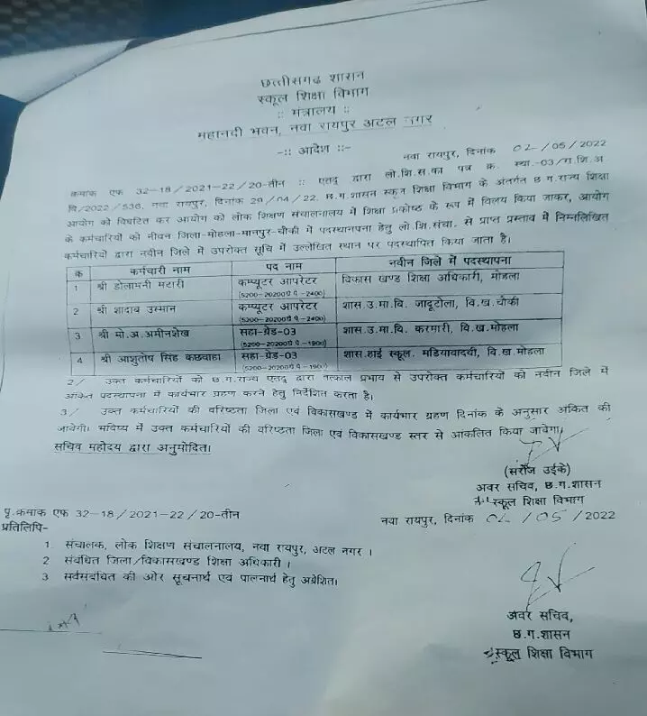 शिक्षा विभाग में जिन नौ लोगों की नियुक्ति का मामला उठा है वह बेहद संदिग्ध है। सरोज उइके अवर सचिव छत्तीसगढ़ शासन स्कूल शिक्षा विभाग के नाम से नौ लोगों में से एक और जारी नियुक्ति पत्र जो 4 मई 2022 को जारी हुआ है। उक्त आदेश के तहत चार कर्मचारी डोलामनी मटारी, शादाब उस्मान, अमीन शेख, आशुतोष सिंह कछवाहा को मोहला मानपुर अंबागढ़ चौकी जिले में पद स्थापना दिया गया।