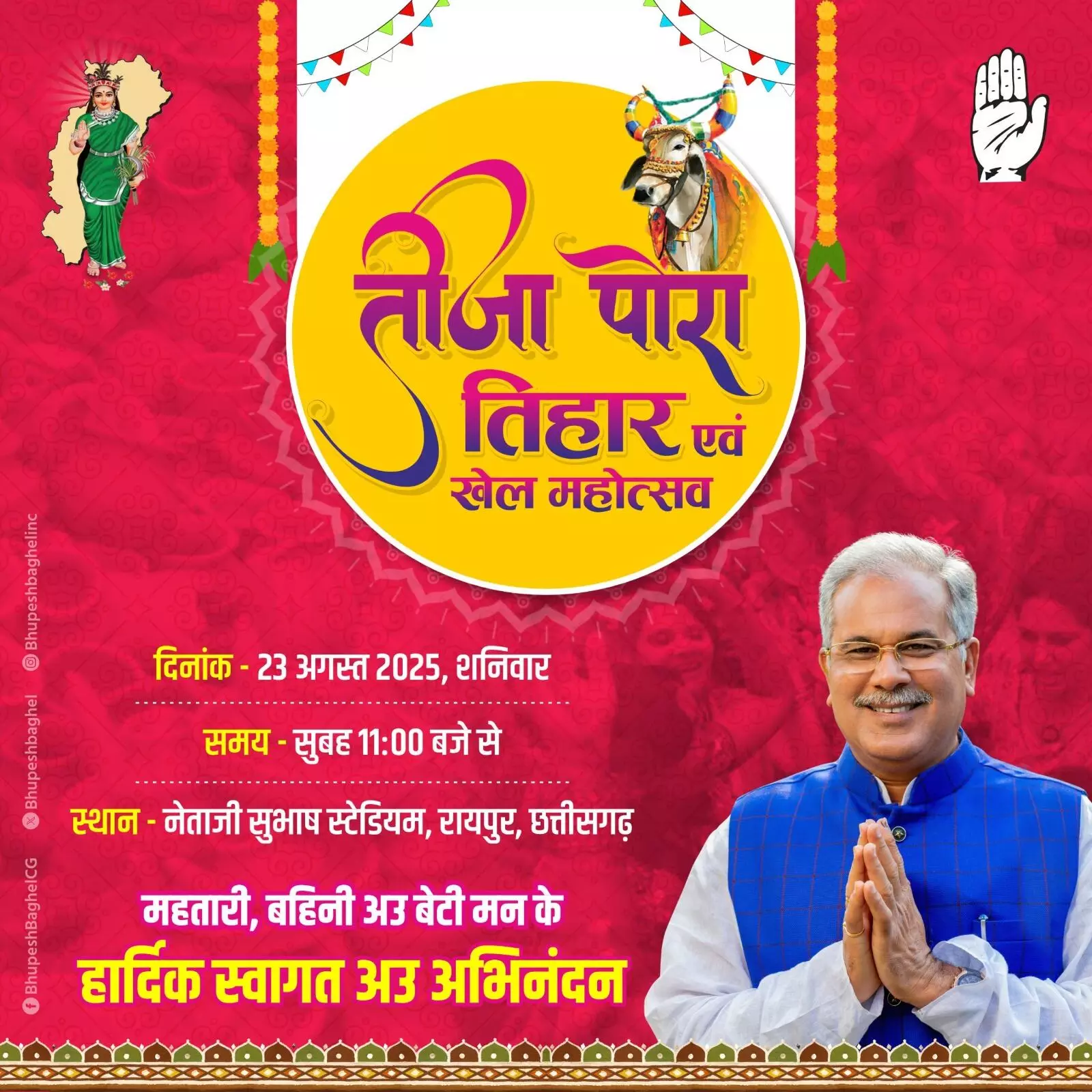 वहीं छत्तीसगढ़ के पूर्व सीएम भूपेश बघेल भी रायपुर के इंडोर स्टेडियम में धूमधाम से तीजा- पोरा तिहार मनाएंगे। दोपहर 11 से कार्यक्रम की शुरुआत होगी। इस अवसर पर बड़ी संख्या में महतारी और बहने शामिल होंगी।