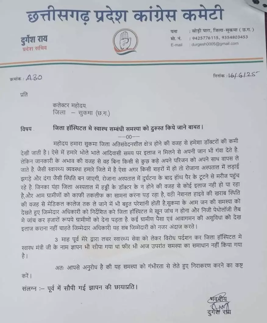 लीलाधर राठी- सुकमा। जिला हॉस्पिटल मे स्वास्थ सम्बंधी समस्या को दुरुस्त किये जाने को लेकर कांग्रेस नेता दुर्गेश रॉय ने कलेक्टर देवेश कुमार ध्रुव को ज्ञापन सौंपा है। ज्ञापन में कहा गया है कि, हमारा सुकमा जिला अतिसंवेदनशील होने की वजह से हमेशा डॉक्टरों की कमी देखी जाती है, ऐसे में हमारे भोले भाले आदिवासी समय पर इलाज न मिलने से अपनी जान भी गंवा देते है।