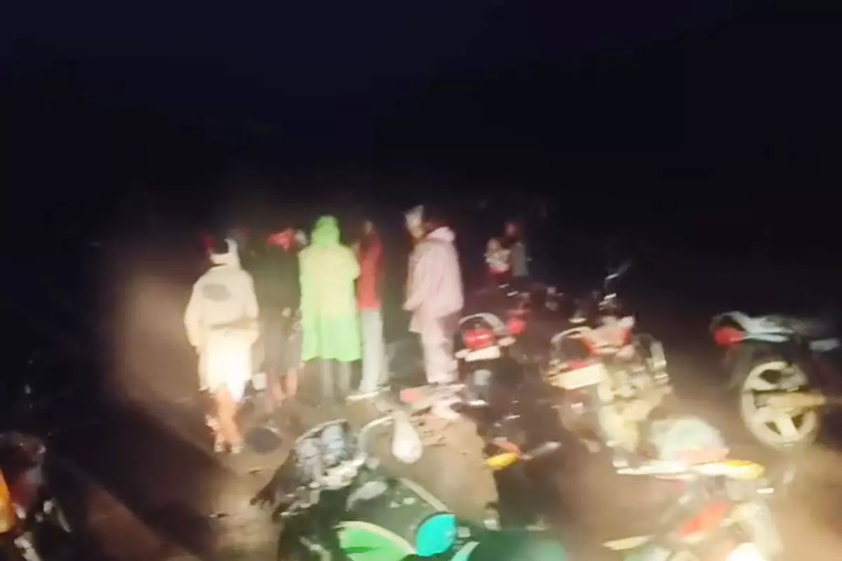 नदी में बाढ़ आने के चलते पानी कम होने का इंतजार करते हुए ग्रामीण
