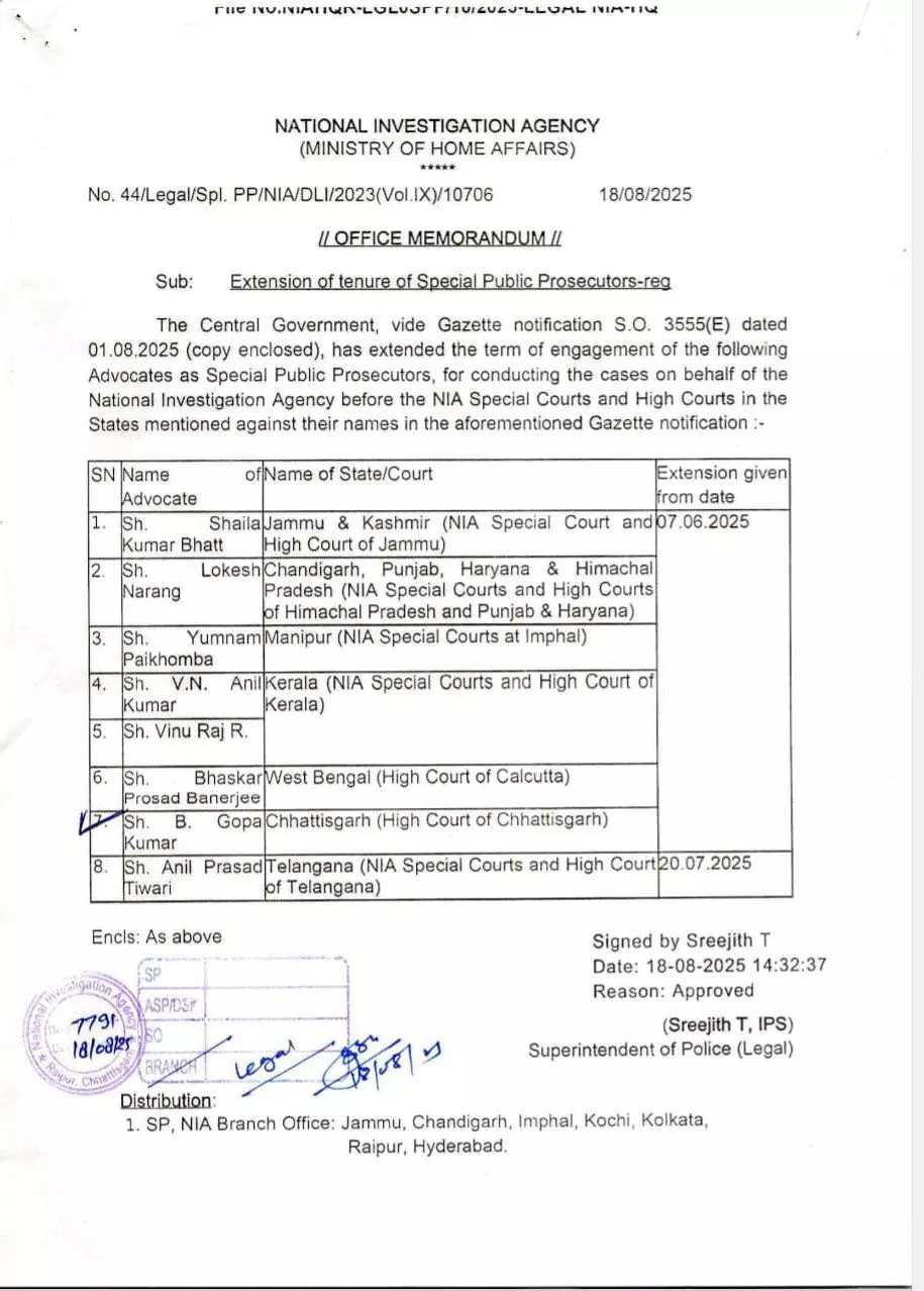 पंकज गुप्ते- बिलासपुर। छत्तीसगढ़ के बिलासपुर हाईकोर्ट में बी. गोपा कुमार को कार्यकाल विस्तार मिला है। राष्ट्रीय जांच एजेंसी ( NIA )ने स्पेशल पब्लिक प्रॉसिक्यूटर का कार्यकाल बढ़ा दिया है। इस संबंध में गृह मंत्रालय की अधिसूचना के बाद NIA ने आदेश जारी किया है। हाईकोर्ट में अब भी बी. गोपा कुमार NIA मामलों की पैरवी करेंगे। देशभर की 8 हाईकोर्ट और स्पेशल कोर्ट के पब्लिक प्रॉसिक्यूटर का कार्यकाल बढ़ाया गया है।