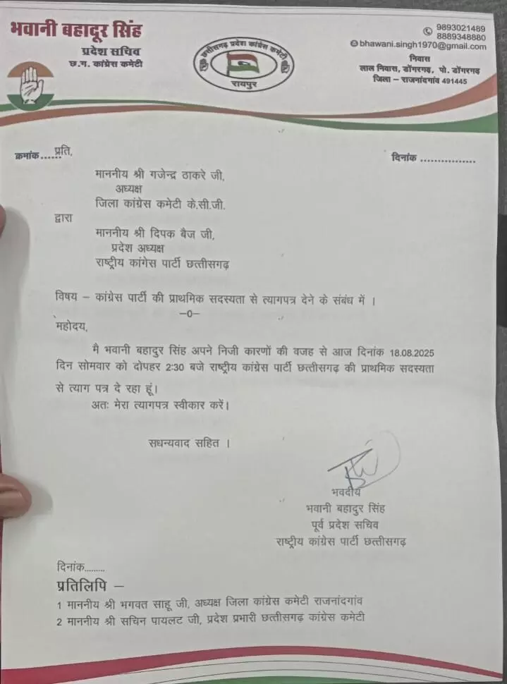 कांग्रेस में एक और इस्तीफा: प्रदेश सचिव भवानी बहादुर सिंह ने छोड़ी पार्टी, निजी कारणों को बताई वजह