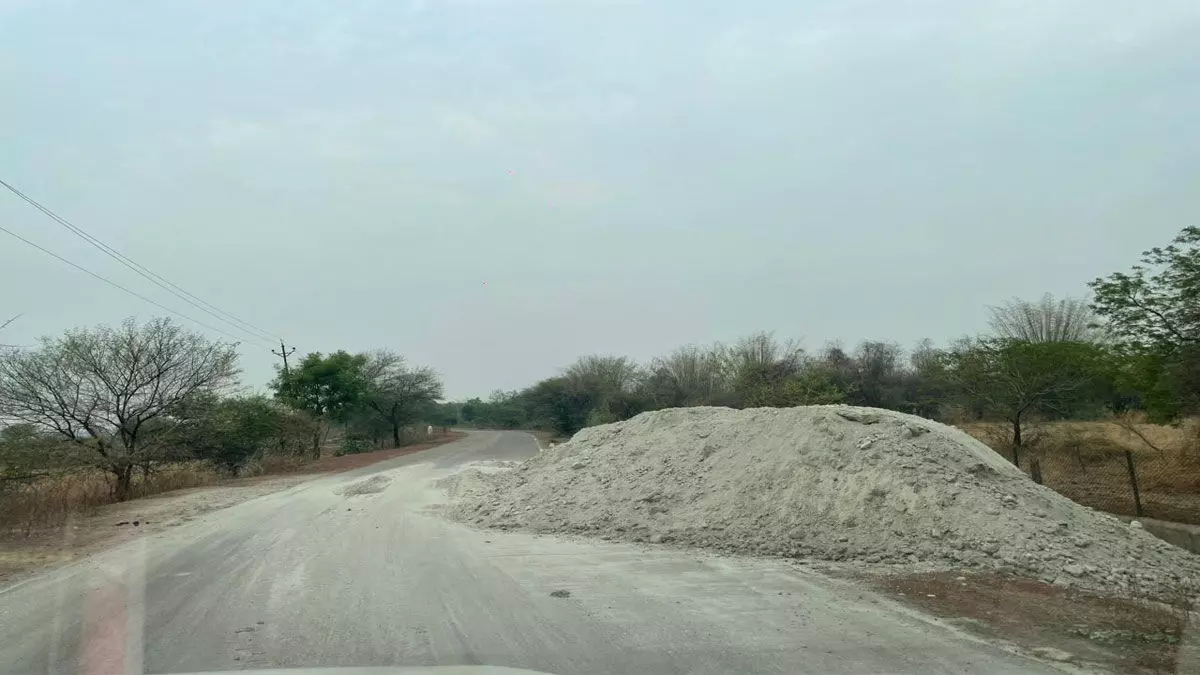 सड़क किनारे फ्लाइऐश डंप: रोड पर बिछ गई सफेद धूल, राहगीर परेशान, स्वास्थ्य पर बुरा असर
