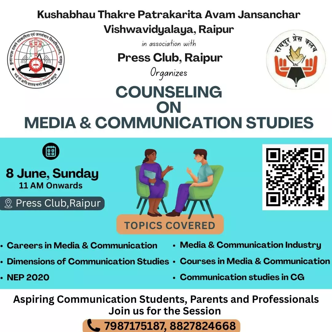 रायपुर। छत्तीसगढ़ की राजधानी रायपुर के कुशाभाऊ ठाकरे पत्रकारिता एवं जनसंचार विश्वविद्यालय के छात्रों के लिए रविवार 8 जून को रायपुर प्रेस क्लब मेंव एक दिवसीय मार्गदर्शन शिविर का आयोजन किया जा रहा है। रविवार की सुबह 11,30 बजे से शाम 4 बजे तक होगा। यह आयोजन रायपुर प्रेस क्लब के समर्थन में आयोजन किया जा रहा है। पत्रकारिता, जनसंचार, विज्ञापन और जनसंपर्क जैसे महत्वपूर्ण विषयों में रुचि रखने वाले विद्यार्थियों और उनके अभिभावकों के लिए यह शिविर आयोजन किया जा रहा है।