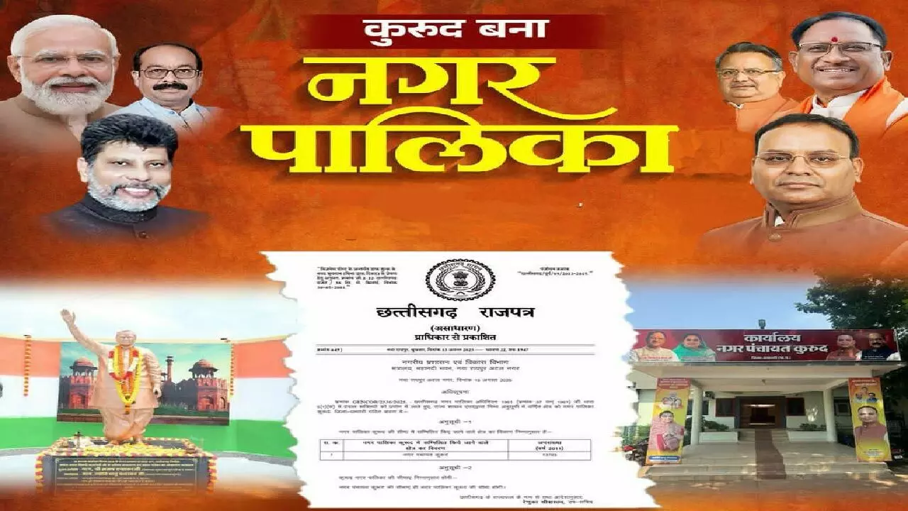 यशवंत गंजीर- कुरुद। छत्तीसगढ़ के कुरुद नगर पंचायत को नगरपालिका का दर्जा मिल गया है। 13 अगस्त को छत्तीसगढ़ के राजपत्र में इसकी अधिसूचना जारी कर राज्य सरकार ने इसकी घोषणा कर दी है। यह उपलब्धि क्षेत्र के विधायक अजय चन्द्राकर के नेतृत्व और नगर पंचायत अध्यक्ष ज्योति भानू चंद्राकर के सतत प्रयास संभव हो पाई है।