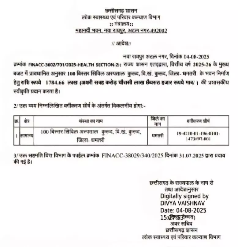 कुरूद को मिली बड़ी सौगात: 100 बिस्तरों वाले सिविल अस्पताल भवन निर्माण के लिए 17.84 करोड़ मंजूर