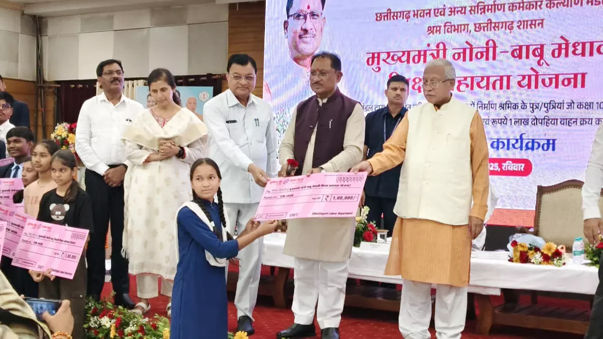रामचरित द्विवेदी - मनेन्द्रगढ़। छत्तीसगढ़ शासन ने श्रमिक परिवारों के मेधावी विद्यार्थियों के प्रोत्साहन के लिए न्यू सर्किट हाउस, सिविल लाइन, रायपुर में एक गरिमामय सम्मान समारोह आयोजन किया। इस अवसर पर मुख्यमंत्री विष्णु देव साय और श्रम मंत्री अनुराग वर्मा ने बोर्ड परीक्षाओं (2024-25) में उत्कृष्ट प्रदर्शन करने वाले श्रमिक परिवारों से आने वाले विद्यार्थियों को 1 लाख रुपये का सांकेतिक चेक और प्रशस्ति पत्र देकर सम्मानित किया।