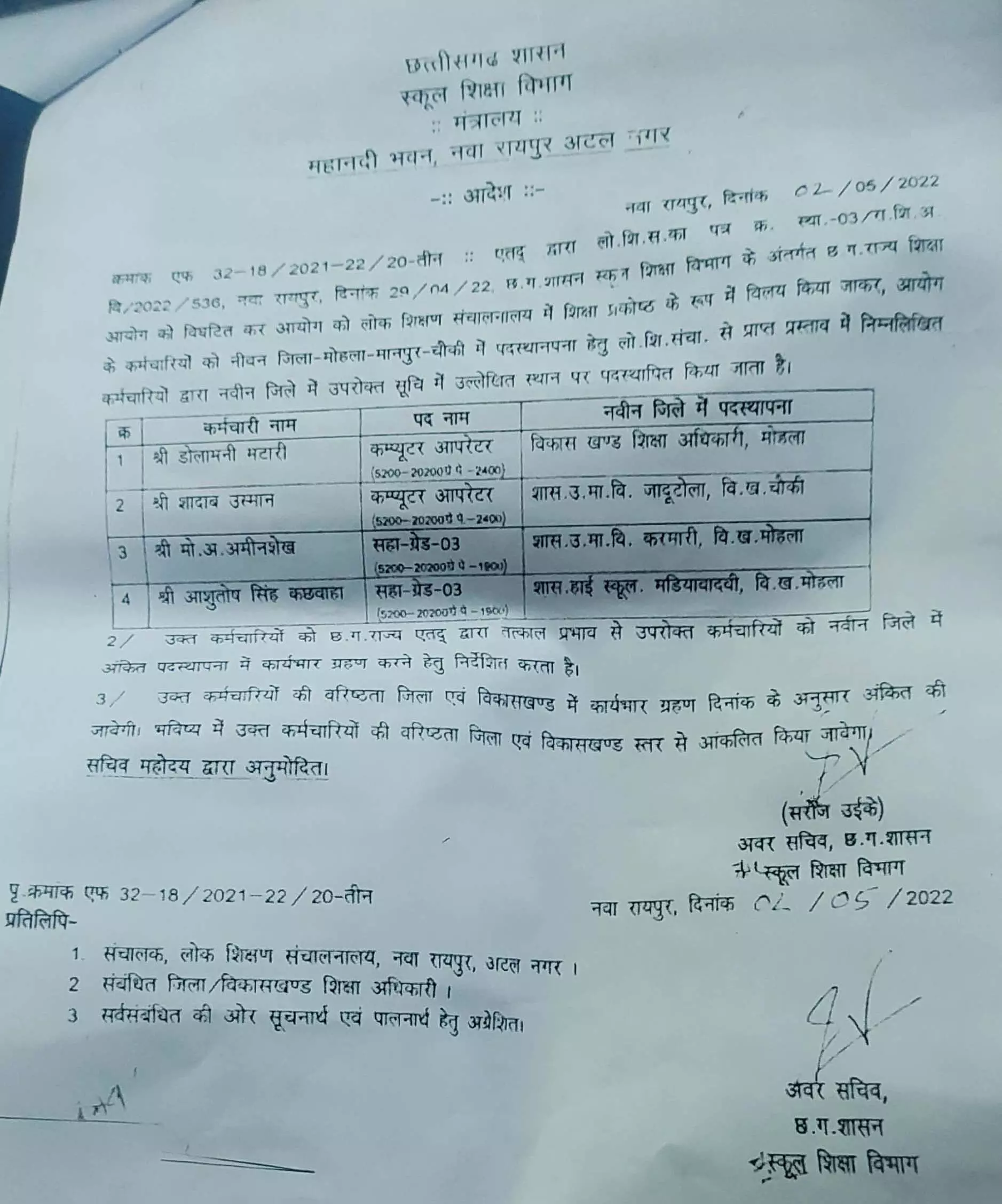 राजनांदगांव से पृथक होकर नये जिला के अस्तित्व में मोहला मानपुर अंबागढ़ चौकी आए। खैरागढ़ जिला मे राजनीतिक उठा पटक और जिला निर्माण के धूम धड़ाका के बीच 5 मई 2022 को शिक्षा आयोग के फर्जी नियुक्ति आदेश और शिक्षा विभाग के अवर सचिव सरोज उईके का तथाकथित पद स्थापना लेटर एवं सर्विस बुक लेकर चार लोग मोहला पहुंचे। जिनमें से दो शिक्षा अधिकारी कार्यालय तथा दो कलेक्टर कार्यालय मे बतौर रेगुलर कर्मचारी के रूप में जॉइनिंग किए। पड़ताल के मुताबिक इसी तरह खैरागढ़ जिला अधिकारी कार्यालय में दो तथा कलेक्टर में दो लोगो ने सरकारी कर्मचारियों के रूप में जॉइनिंग किए हैं।