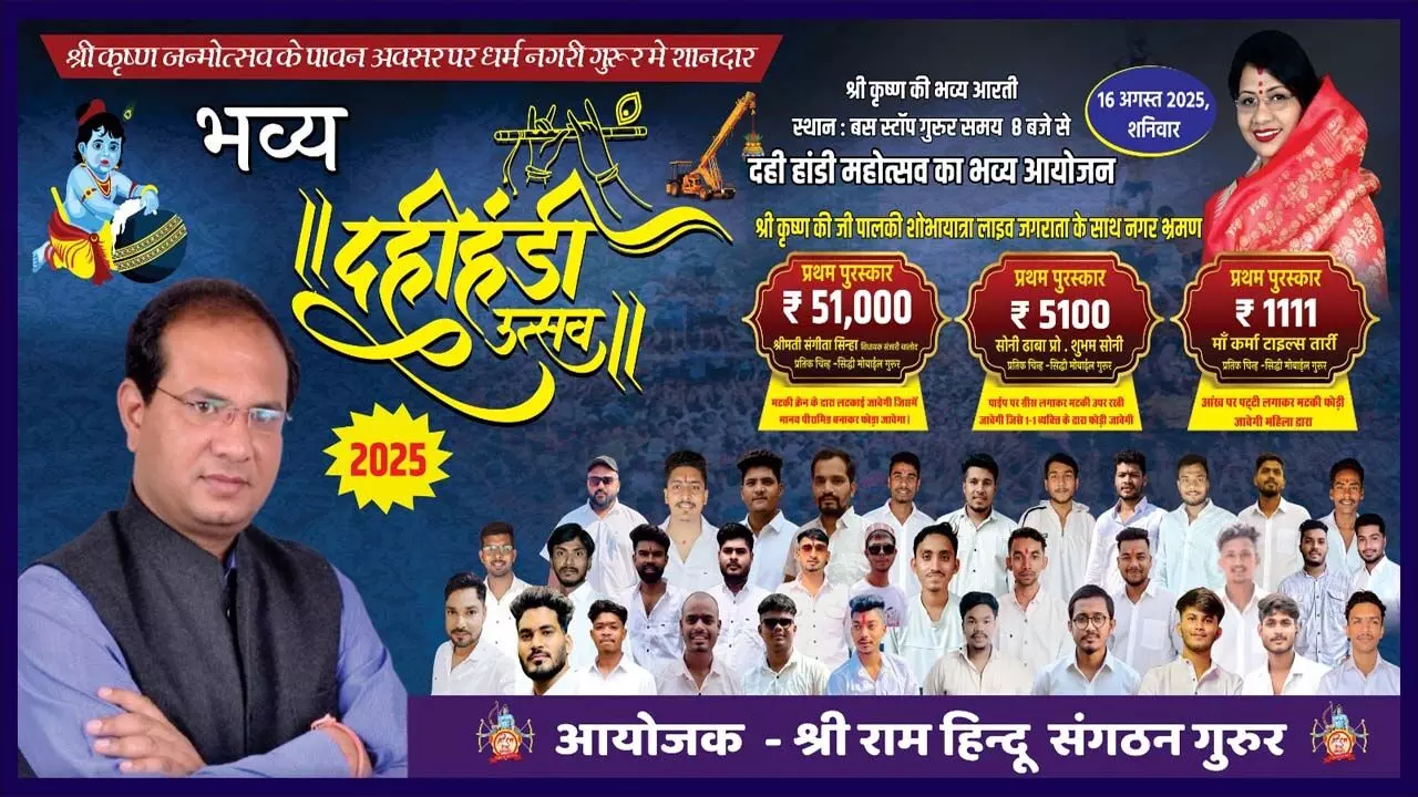 एनिशपुरी गोस्वामी - मोहला। छत्तीसगढ़ के धमतरी जिले के गुरुर नगर में कृष्ण जन्माष्टमी के पावन अवसर पर दही लूट कार्यक्रम का आयोजन किया गया। जहां मोहला मानपुर अंबागढ़ चौकी जिले के ग्राम पंचायत कौड़ीकसा के युवाओं ने इस साल का खिताब अपने नाम किया है। गुरुर गांव के इस आयोजन में 51 हजार नगद तथा शील्ड को अपना बनाने के लिए प्रदेश के अलग-अलग हिस्सों से प्रतिभागी भाग लिए थे।