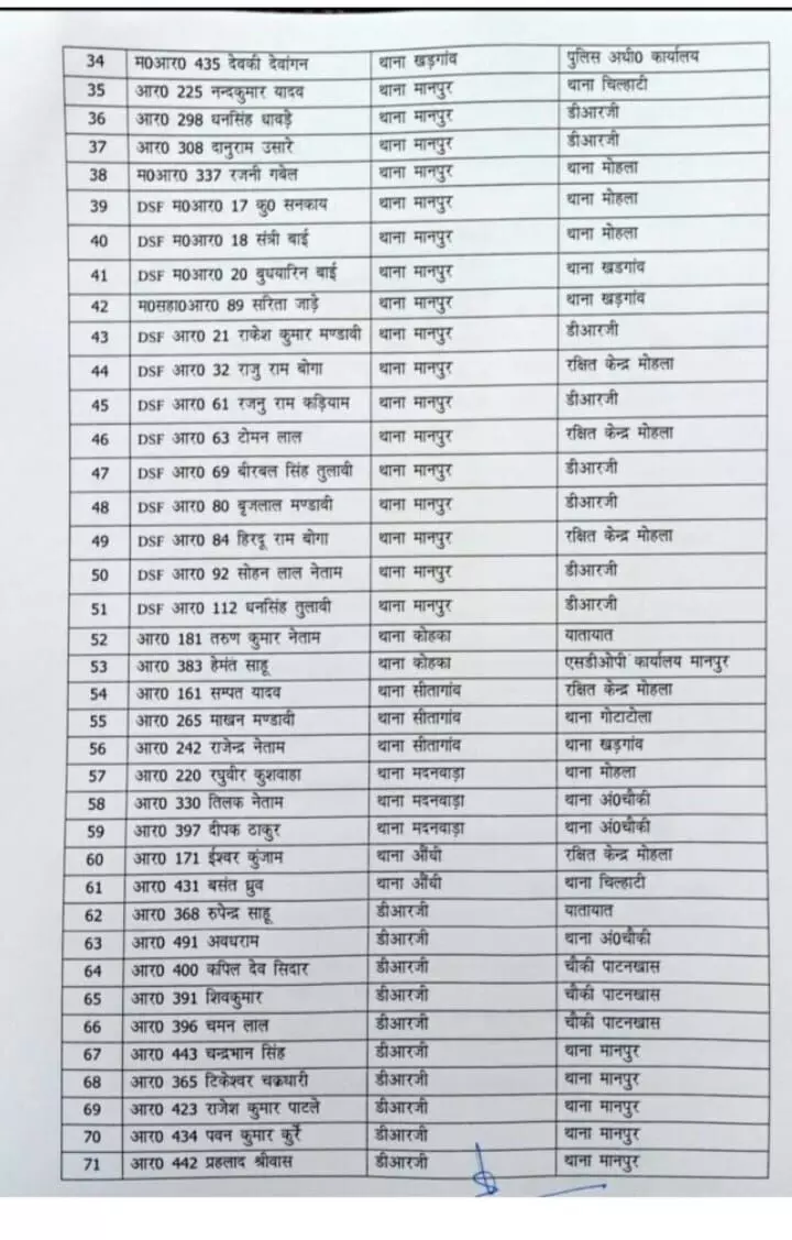मोहला जिले के एसपी वायपी सिंह ने आरक्षक, महिला आरक्षक सहित कुल 96 पुलिसकर्मियों का तबादला किया है।