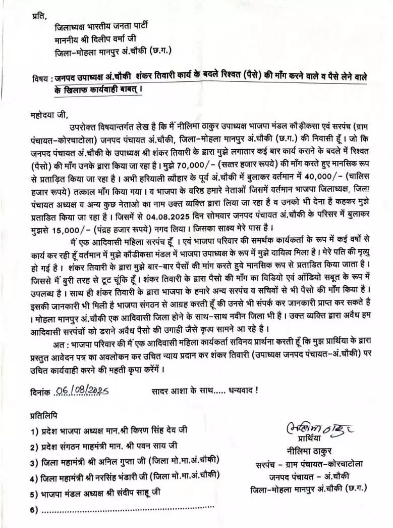 कोरचा टोला की आदिवासी महिला सरपंच नीलिमा ठाकुर ने जिला भाजपा को लिखे पत्र में कहां है कि, वह एक आदिवासी महिला सरपंच है। भाजपा परिवार की समर्थक है। पिछले कई वर्षों से पार्टी में काम कर रही है। वर्तमान में वह कौड़ीकसा मंडल में भाजपा उपाध्यक्ष का दायित्व निभा रही हैं। पति की मृत्यु हो गई है, जनपद उपाध्यक्ष शंकर तिवारी बार-बार पैसों की मांग करते हुए मानसिक रूप से प्रताड़ित कर रहे हैं, जिससे वह बुरी तरह से टूट चुकी हैं।
