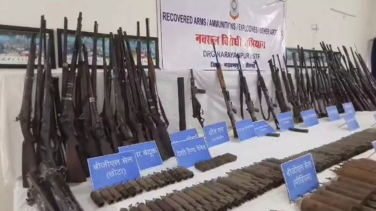 इमरान खान- नारायणपुर। छत्तीसगढ़ के नारायणपुर जिले के घने जंगलों में सुरक्षाबलों की टीम लगातार माड़ बचाओ अभियान चला रही है। इस दौरान शुक्रवार को सुरक्षाबलों और माओवादियों के बीच मुठभेड़ हुई। सुरक्षाबलों की भीषण गोलाबारी से दहशत में आकर नक्सली अपना सारा सामना छोड़कर जान बचाकर भाग खड़े हुए। बाद में सर्चिंग करने पर मुठभेड़ स्थल से LMG, AK-47 (त्रिची), इंसास, SLR, स्टेनगन, जैसे अत्याधुनिक हथियारों सहित भारी मात्रा में BGL सेल, डेटोनेटर, कार्डेक्स के साथ 300 से अधिक सामग्री जब्त की है।