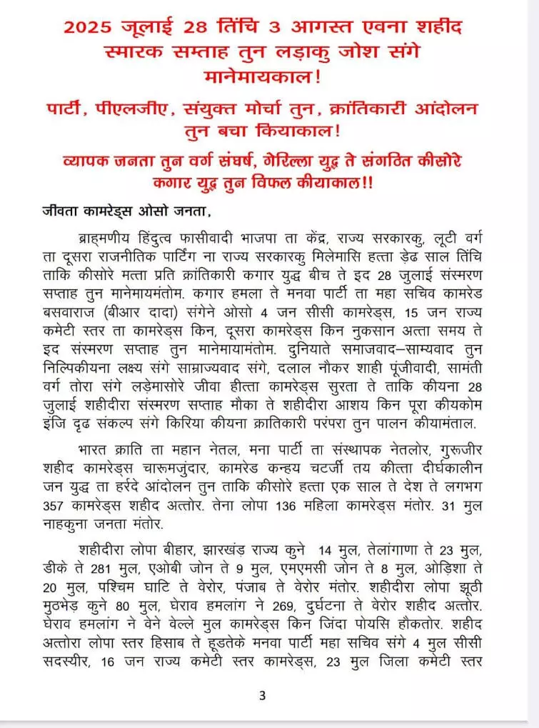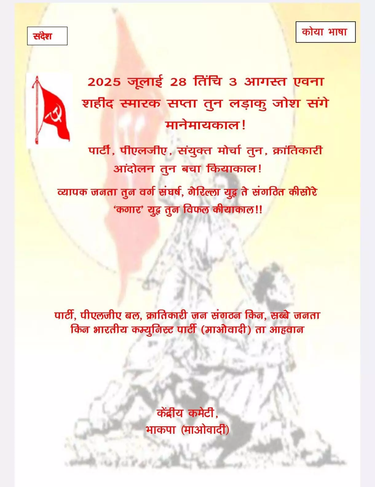 गणेश मिश्रा- बीजापुर। छत्तीसगढ़ के बीजापुर जिले के नक्सलियों की केंद्रीय कमेटी ने एक प्रेस नोट जारी किया है। जिसमें उन्होंने बड़ी संख्या में नक्सलियों के मारे जाने को स्वीकार किया है। नक्सलियों ने 24 पेज का गोंडी बोली और इंग्लिश में बुकलेट भी जारी किया। वहीं नक्सली मारे गए साथियों की याद में नक्सली 28 जूलाई से 3 अगस्त तक शहीदी सप्ताह मनाएँगे।